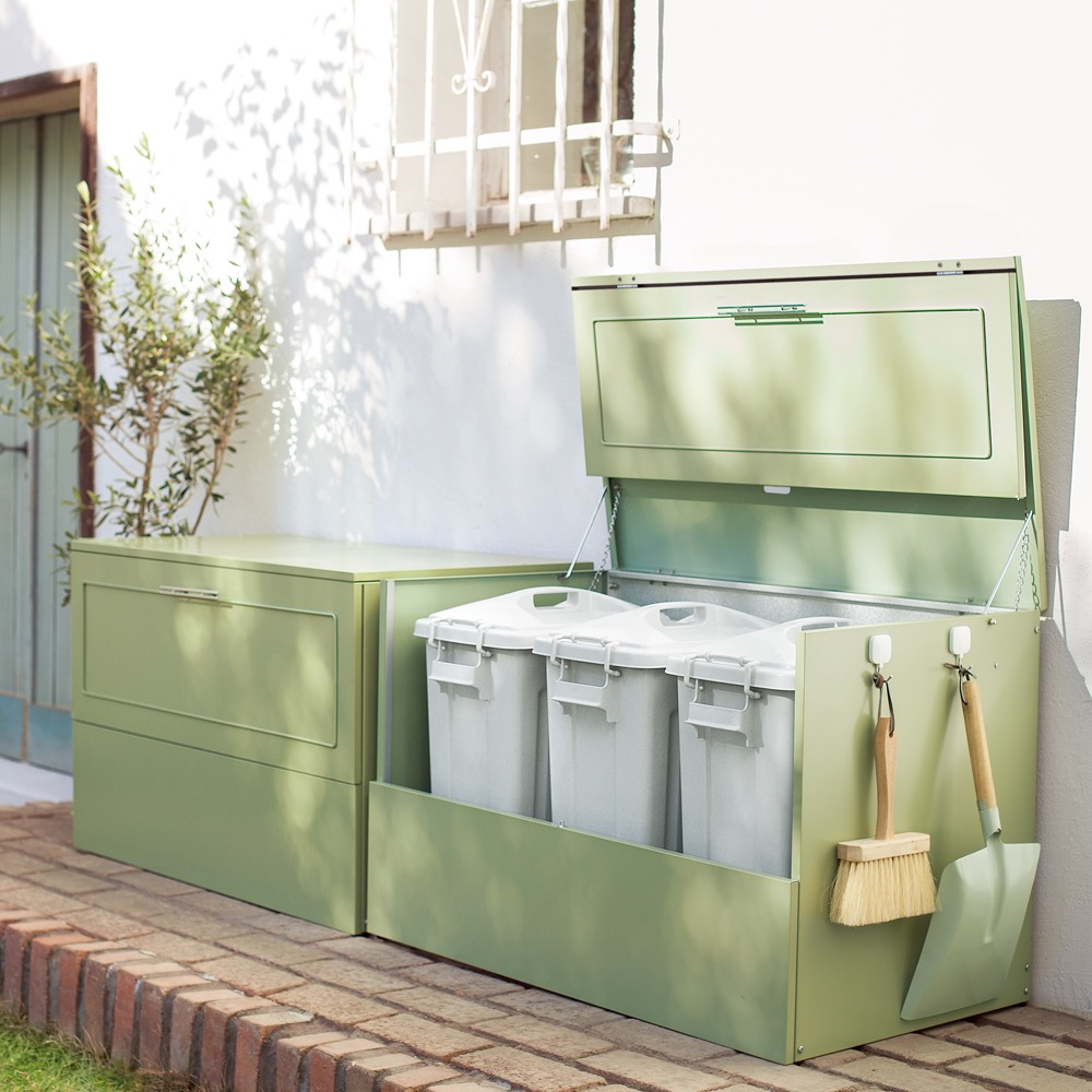 庭を素敵に見せるこだわりカラー。一見、ダストボックスとは思えない洗練デザイン。生活感を上手に隠せます。大きく開いて出し入れしやすく、実用度も優秀。◎植物が映えるセージグリーン◎・草花を美しくみせるために、英国園芸研究家の吉谷桂子さんがこだわってセレクトしたカラー。・植物となじみがよく、葉や花の色、形をひきたてる人気の色です。◎おうちの顔である玄関先に、スタイリッシュな屋外ダストボックス◎・ゴミの分別が進んだ地域では、ゴミの収集待ちも頭の痛い問題。・なかなかめぐってこない資源ごみの待機場所、屋外ボックスで解決しませんか?◎あふれがちな分別ごみに指定席を◎・大容量のダストストッカーで、あふれがちな分別ごみに指定席をつくります。・ガーデンやエントランスに違和感のない屋外用ストッカーで、ダスト待機の指定席を。◎外からの目線が気にならないデザイン◎・家の外に置くダストボックスは、意外とご近所の視線にさらされます。・玄関先や勝手口脇など、外からの目線が気になるゴミ箱(ダストボックス)は、スタイリッシュなモデルがおすすめ。◎ゴミの出し入れのしやすさを第一に考えました◎・前面と天板が連動して大きく開きます。大きな開口部で、かがまなくてもゴミを出し入れできます。・ごみの出し入れ簡単。ワイドオープンタイプなので、ガレージ内の壁際や通路脇の狭いスペースでも開閉OK。・種別に分別したゴミも余裕で待機できる、大容量が自慢です。◎耐候性に優れたガルバリウム鋼板を使用◎・サビに強いガルバリウム鋼板とボンデ鋼板製のシンプルな収納庫は、雨が入りにくい構造です。◎付属のマグネットフックで効率的に収納◎・ほうきやチリトリなど勝手口まわりの用品を一か所にまとめておけます。◎脚部にはアジャスター付き◎・設置時のガタツキを抑えるアジャスターが付いています。・設置場所に傾斜がある場合も、ストッカーを水平に設置できます。◎お庭づくりを支えるエクステリア収納◎・玄関先などのおうち周りを整えれば、すまいの地域全体の快適性にも貢献できます。・設置場所や条件に合わせたダストボックスや物置き・収納庫をチョイスして、快適なエクステリアの収納プランを。【ガルバリウム鋼板】・アルミニウムを溶融した亜鉛合金メッキで表面処理し、耐久性・耐熱性と防食作用を兼ねそなえた鋼板です。【信頼と安心の国内工場での生産品】・管理の行き届いた日本国内の工場で、加工から製造、梱包に至るまで丁寧に仕上げました。・細部の丁寧な仕上がり、国産品ならではの品質は自信を持っておすすめします。