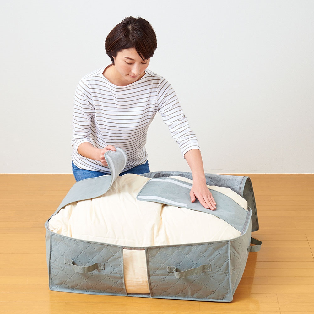布団押さえバンド付で便利!掃除機いらずで布団をしまえる収納袋です。●コンパクトに収納できる布団収納袋●取り出しやすい持ち手付●中身が見える透明窓付●通気性の良い不織布生地●使わない時はコンパクトに折りたためます●大と小は高さの違いなので、重ね置きがラクラク!●使用目安/大:厚手の掛け布団 1枚 セミダブル、ダブルの掛け布団 1枚小:薄手の夏掛け布団 2枚 薄手の羽毛布団 1枚