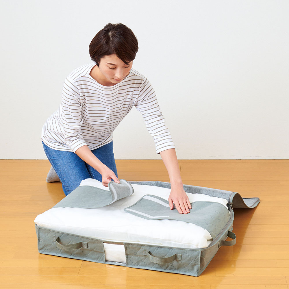 布団押さえバンド付で掃除機いらずで布団をしまえる収納袋です。