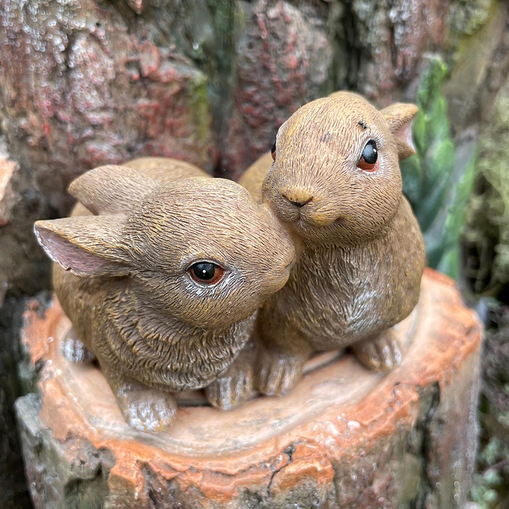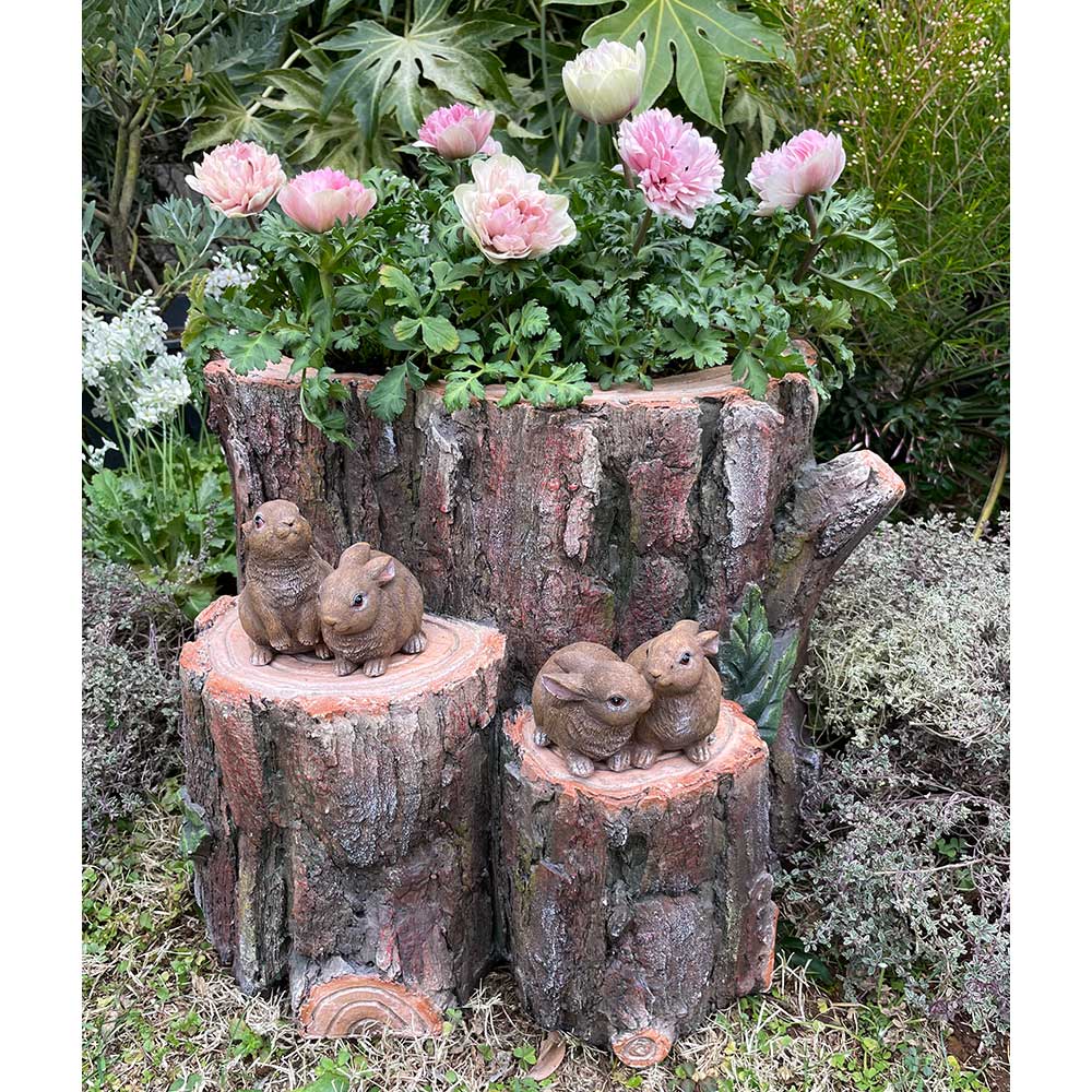 森の中のような一幕をお庭に。本物かと見間違えそうなリアルな切り株のプランター、寄り添って甘える親子ウサギ。ほっと心和むシーンを演出します。
