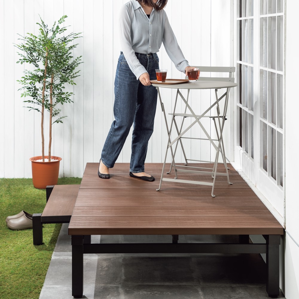 生活動線を考えた奥行。◆生活動線を考えた奥行!今までのデッキの多くは、奥行90センチ。奥行90センチのデッキ上に家具を置くと人が通れるスペースが無い…本商品はそんな悩みを解決!デッキ上に家具を置いても人が通れる奥行120センチの設計なんです。◆耐久性に優れた人工木素材!腐食や日焼けに強い人工木素材。アルミより熱くなりにくく、落ち着いた木のトーンで長くキレイを保ちます。