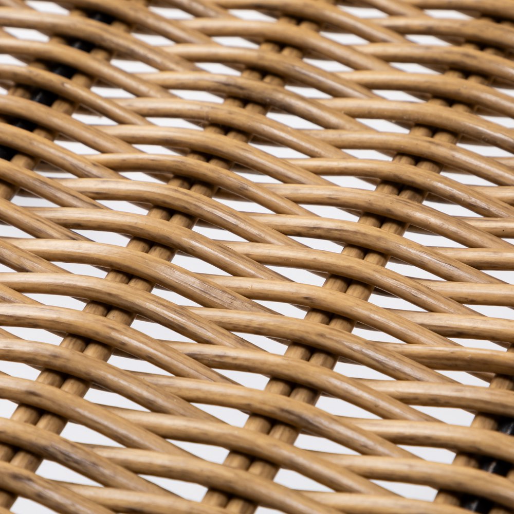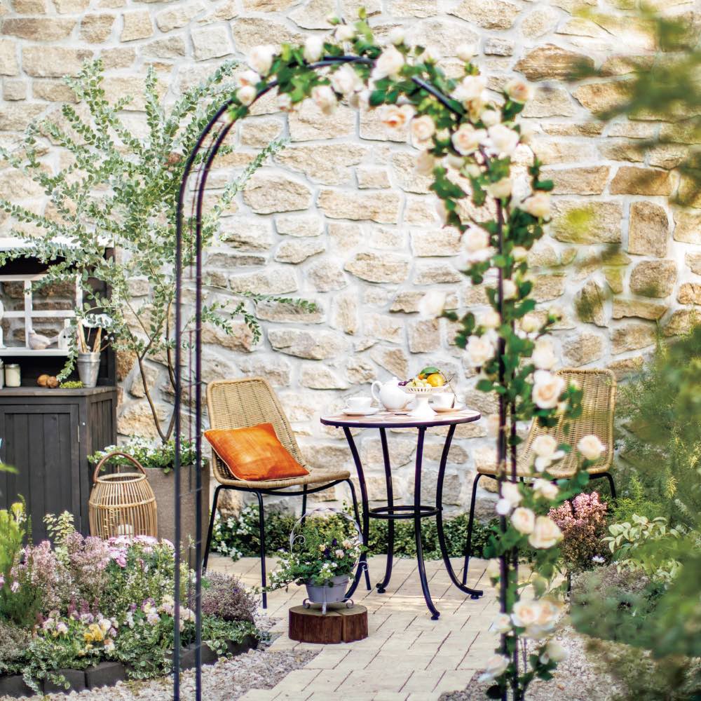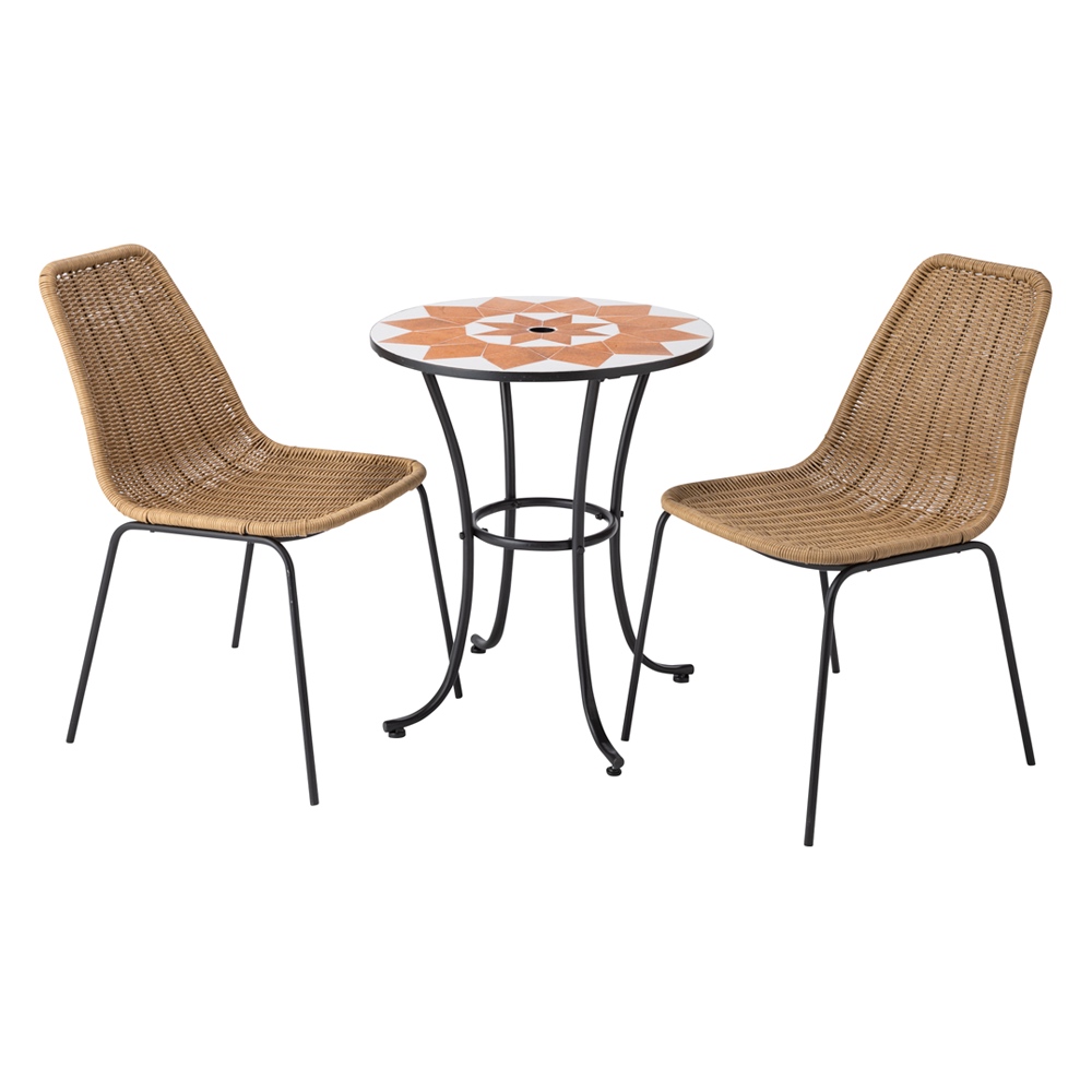 テーブルは華やかな大柄、ベージュやグレイの外壁になじむ色味。洗練デザインのチェアは、天然素材のような見た目ですがフェイクなので朽ちません。ベランダにぴったりのサイズも魅力。