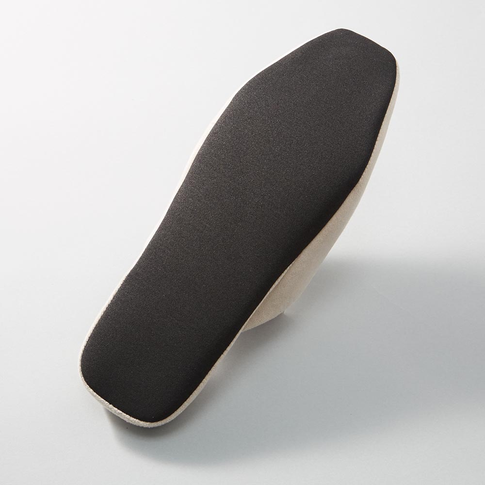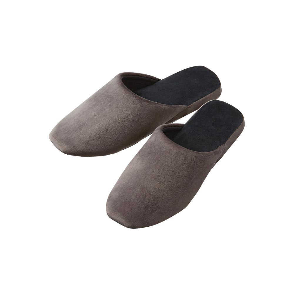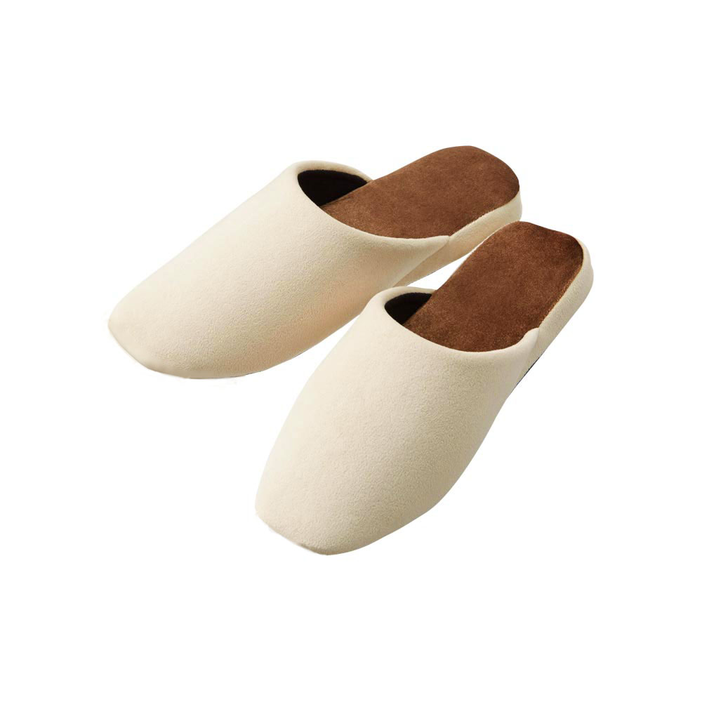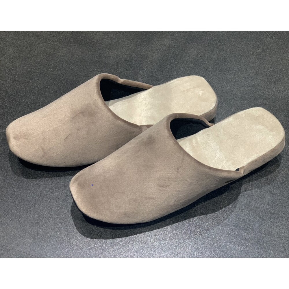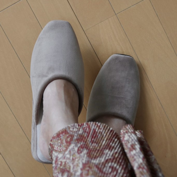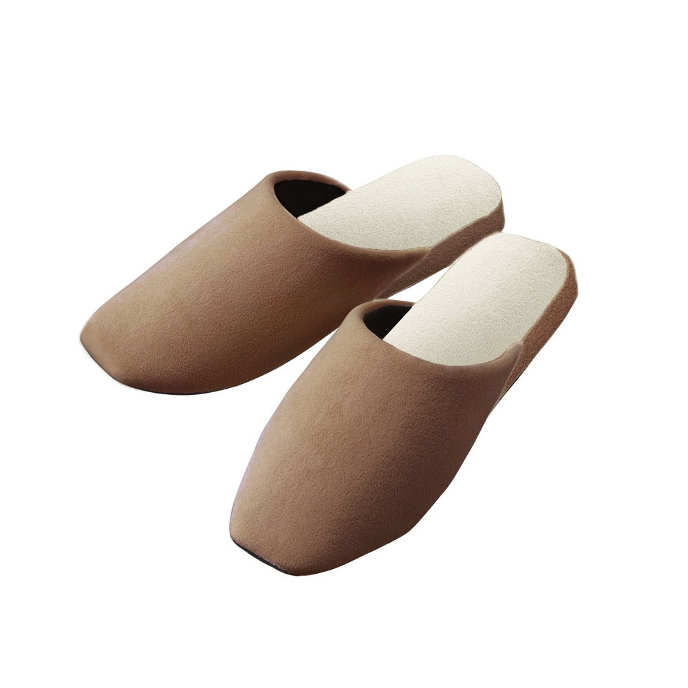 (ウ)ソフトブラウン 端正なスクエア型とスエード調素材の美しいデザインのスリッパ。