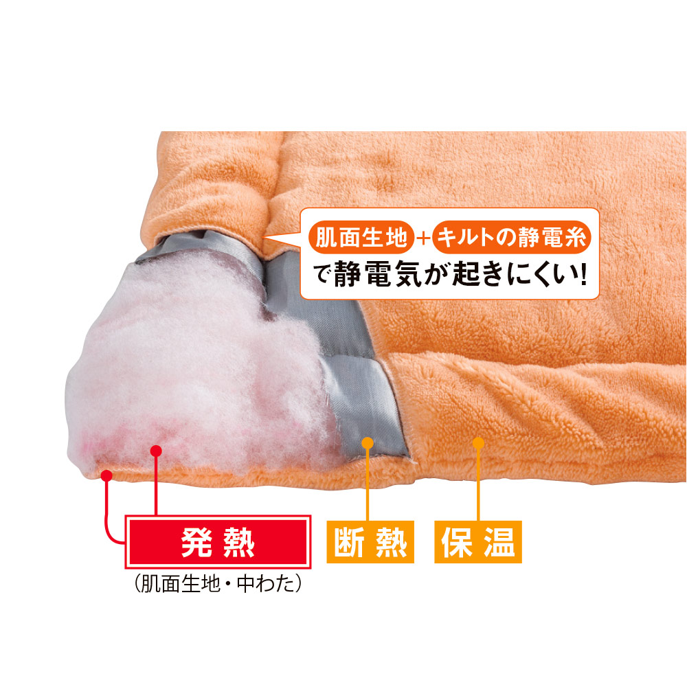 肌面の側生地は発熱素材を使用し、さらに暖かく!毛足の密集したふんわりなめらかなマイクロファイバーが暖気をしっかりキープ。また公定水分率の高いレーヨン混になり、さらに静電気が起きにくく、快適に。