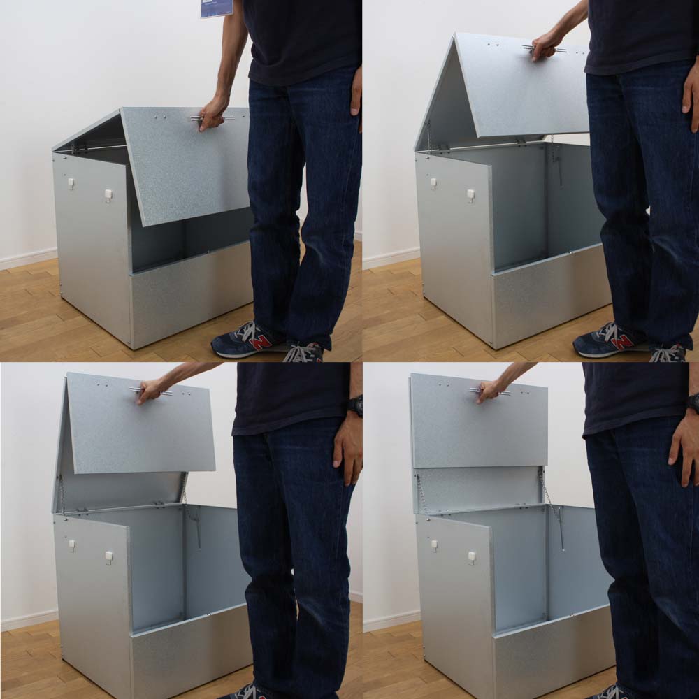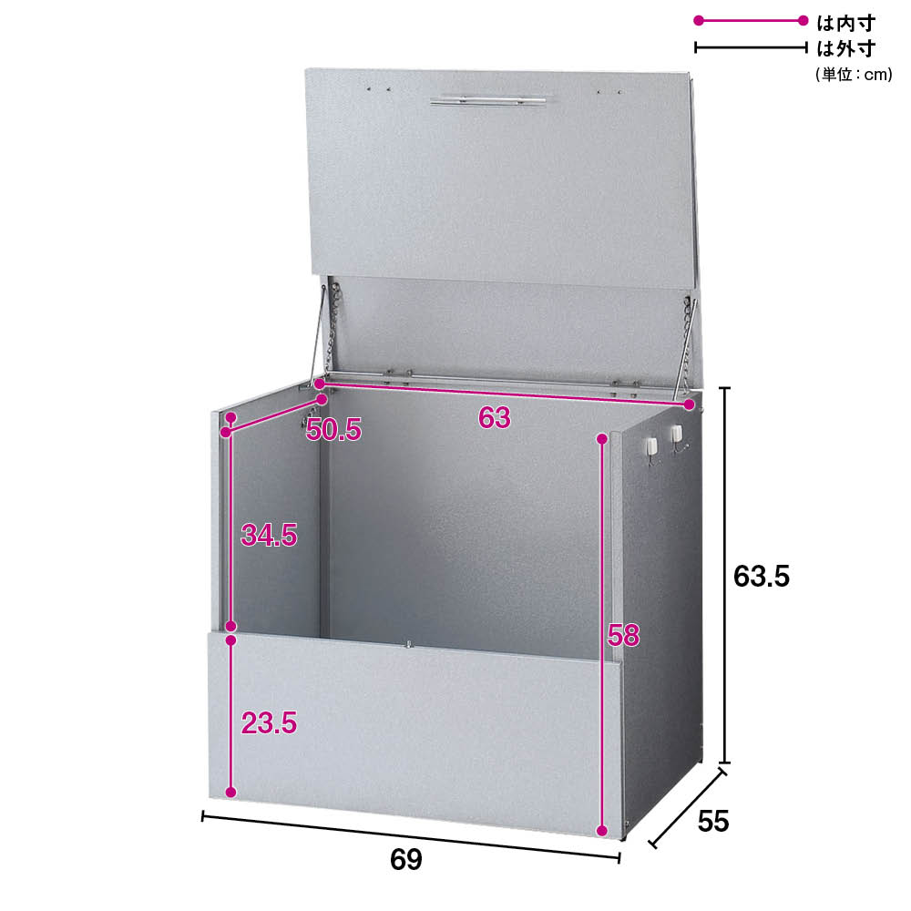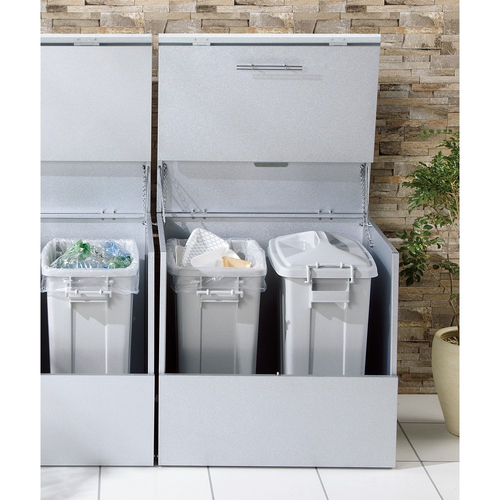 おうちの顔である玄関先に、スタイリッシュな屋外ダストボックス。大容量のダストストッカーで、あふれがちな分別ごみに指定席をつくる屋外ゴミ箱です。玄関先や勝手口に、スタイリッシュな屋外ダストボックスゴミの分別が進んだ地域では、ゴミの収集待ちも頭の痛い問題。なかなかめぐってこない資源ごみの待機場所、屋外ボックスで解決しませんか?大容量のダストストッカーで、あふれがちな分別ごみに指定席をつくります。外からの目線が気にならないデザイン家の外に置くダストボックスは、意外とご近所の視線にさらされます。玄関先や勝手口脇など、外からの目線が気になるゴミ箱(ダストボックス)は、スタイリッシュなモデルがおすすめ。ガーデンやエントランスに違和感のない屋外用ストッカーで、ダスト待機の指定席を。ガーデニング好きの方におすすめしたい、情景になじむデザインが自慢です。ゴミの出し入れのしやすさを第一に考えました前面と天板が連動して「がばっ」と大きく開きます。大きな開口部で、かがまなくてもゴミを出し入れできます。ごみの出し入れ簡単。ワイドオープンタイプなので、ガレージ内の壁際や通路脇の狭いスペースでも開閉OK。種別に分別したゴミも余裕で待機できる、大容量が自慢です。素材や機能にもこだわり満載耐候性や耐腐食性に優れたガルバリウム鋼を使用したシンプルな収納庫です。付属のマグネットフックで効率的に収納できます。ほうきやチリトリなど勝手口まわりの用品を一か所にまとめておけます。脚部にはアジャスター付き設置時のガタツキを抑えるアジャスターが付いています。設置場所に傾斜がある場合も、ストッカーを水平に設置できます。プラスチックペールでニオイ対策密閉性をより高めるプラスチックペール付き。ボックス内にセットできるプラスチック製ペールを2個セット。ペールには臭い漏れを防ぐため、パッキン付きのフタを設けました。付属のペールは、単体でご使用の際は付属のキャスターがお使いいただけます。お庭づくりを支えるエクステリア収納ガーデニング雑貨やベランダ用品もたっぷり収納できます。設置場所や条件に合わせた物置き収納庫をチョイスして、快適なエクステリアの収納プランを。【信頼と安心の国内工場での生産品】管理の行き届いた日本国内の工場で、加工から製造、梱包に至るまで丁寧に仕上げました。細部の丁寧な仕上がり、国産品ならではの品質は自信を持っておすすめします。【ガルバリウム鋼板】アルミニウムを溶融した亜鉛合金メッキで表面処理し、耐久性耐熱性と防食作用を兼ねそなえた鋼板です。