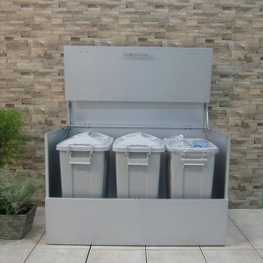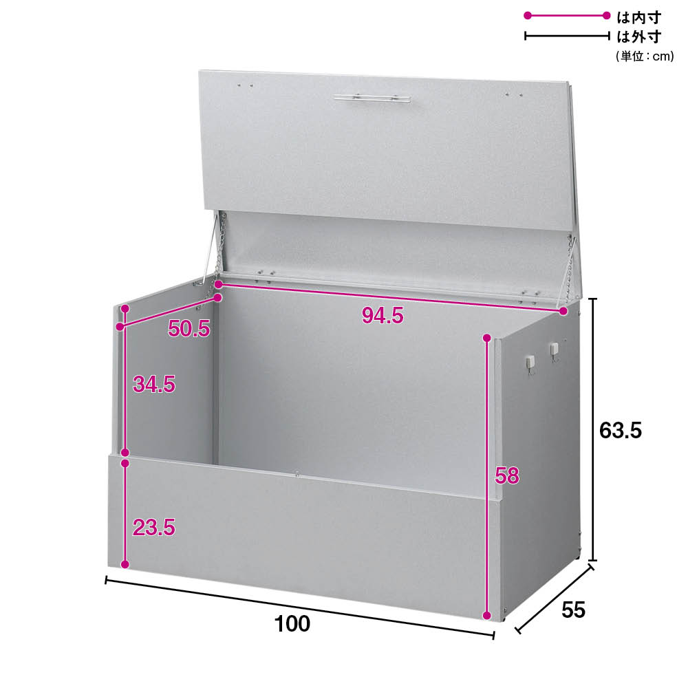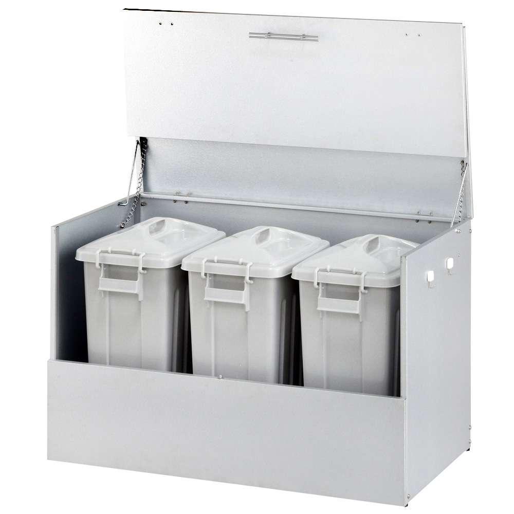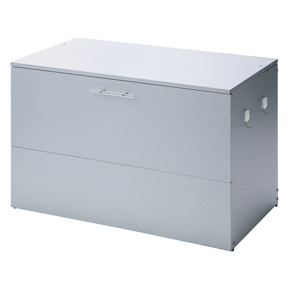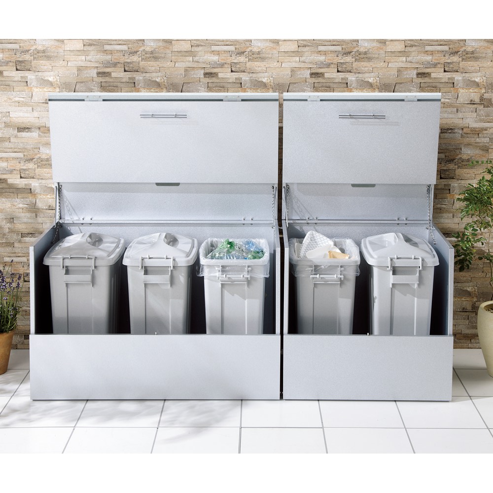 おうちの顔である玄関先に、スタイリッシュな屋外ダストボックス。大容量のダストストッカーで、あふれがちな分別ごみに指定席をつくる屋外ゴミ箱です。玄関先や勝手口に、スタイリッシュな屋外ダストボックスゴミの分別が進んだ地域では、ゴミの収集待ちも頭の痛い問題。なかなかめぐってこない資源ごみの待機場所、屋外ボックスで解決しませんか?大容量のダストストッカーで、あふれがちな分別ごみに指定席をつくります。外からの目線が気にならないデザイン家の外に置くダストボックスは、意外とご近所の視線にさらされます。玄関先や勝手口脇など、外からの目線が気になるゴミ箱(ダストボックス)は、スタイリッシュなモデルがおすすめ。ガーデンやエントランスに違和感のない屋外用ストッカーで、ダスト待機の指定席を。ガーデニング好きの方におすすめしたい、情景になじむデザインが自慢です。ゴミの出し入れのしやすさを第一に考えました前面と天板が連動して「がばっ」と大きく開きます。大きな開口部で、かがまなくてもゴミを出し入れできます。ごみの出し入れ簡単。ワイドオープンタイプなので、ガレージ内の壁際や通路脇の狭いスペースでも開閉OK。種別に分別したゴミも余裕で待機できる、大容量が自慢です。素材や機能にもこだわり満載耐候性や耐腐食性に優れたガルバリウム鋼を使用したシンプルな収納庫です。付属のマグネットフックで効率的に収納できます。ほうきやチリトリなど勝手口まわりの用品を一か所にまとめておけます。脚部にはアジャスター付き設置時のガタツキを抑えるアジャスターが付いています。設置場所に傾斜がある場合も、ストッカーを水平に設置できます。プラスチックペールでニオイ対策密閉性をより高めるプラスチックペール付き。ボックス内にセットできるプラスチック製ペールを3個セット。ペールには臭い漏れを防ぐため、パッキン付きのフタを設けました。付属のペールは、単体でご使用の際は付属のキャスターがお使いいただけます。お庭づくりを支えるエクステリア収納ガーデニング雑貨やベランダ用品もたっぷり収納できます。設置場所や条件に合わせた物置き収納庫をチョイスして、快適なエクステリアの収納プランを。【信頼と安心の国内工場での生産品】管理の行き届いた日本国内の工場で、加工から製造、梱包に至るまで丁寧に仕上げました。細部の丁寧な仕上がり、国産品ならではの品質は自信を持っておすすめします。【ガルバリウム鋼板】アルミニウムを溶融した亜鉛合金メッキで表面処理し、耐久性耐熱性と防食作用を兼ねそなえた鋼板です。