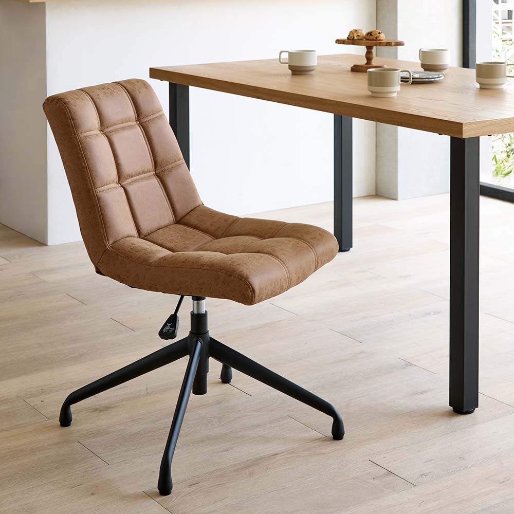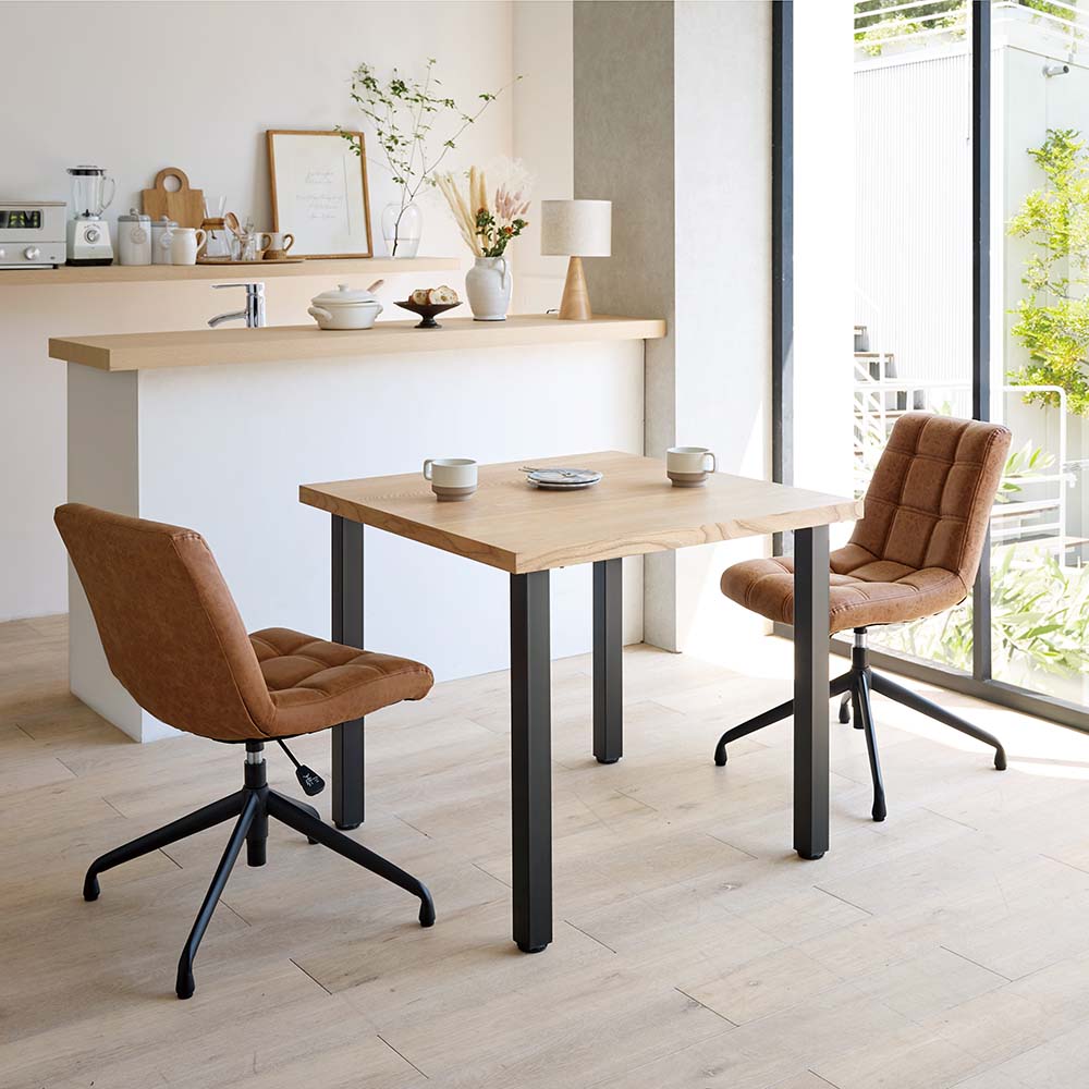 子供は高く、大人は低めにすれば笑顔の目線が揃えられて団らんもより楽しく。ビンテージ風の回転昇降ワークチェア。リビングでもダイニングでも合わせやすいデザイン。食事もテレワークもOK!お得な同色2脚組。使う人に合わせて、座面もベストな高さにテーブルの高さに合わせて、椅子の高さも調節したい――。そんなときに便利なのが昇降機能。座面を少し高くするだけで、子どもや小柄な方でも無理のない姿勢で食事ができます。食事だけでなく、勉強や在宅ワーク、アイロンがけなど…暮らしのさまざまなシーンに応じて、ちょうどいい高さで使えるのが魅力です。おしゃれなデスクチェアが欲しい方へ「本格的なオフィスチェアだとちょっと大げさ…」「でもダイニングチェアでは長時間はつらい」そんな声に応えるのが、こちらの昇降回転チェア。ダイニングやリビングにも自然になじむ、シンプルで上品なデザインです。機能性もしっかり張り地には、味わいのある合成皮革を使用。厚みのある座面で、ほどよいクッション性も◎。ダイニングチェアのようなコンパクトサイズながら、昇降機能付きでデスクや身体に合わせて高さを調整できます。360度回転式なので、狭いスペースでも立ち座りがスムーズ。キャスターはあえて付けず、フローリングを傷つけにくい仕様にしています。