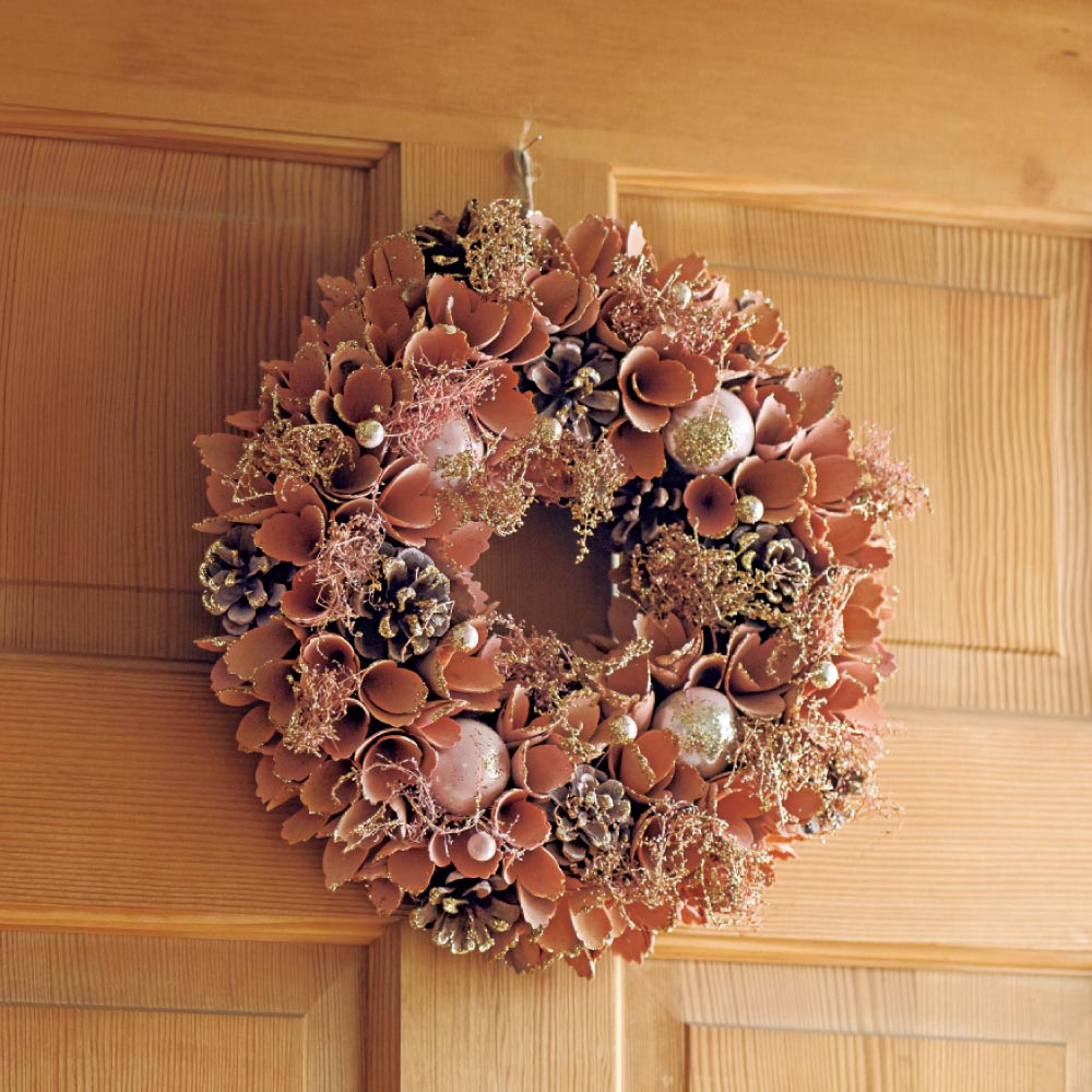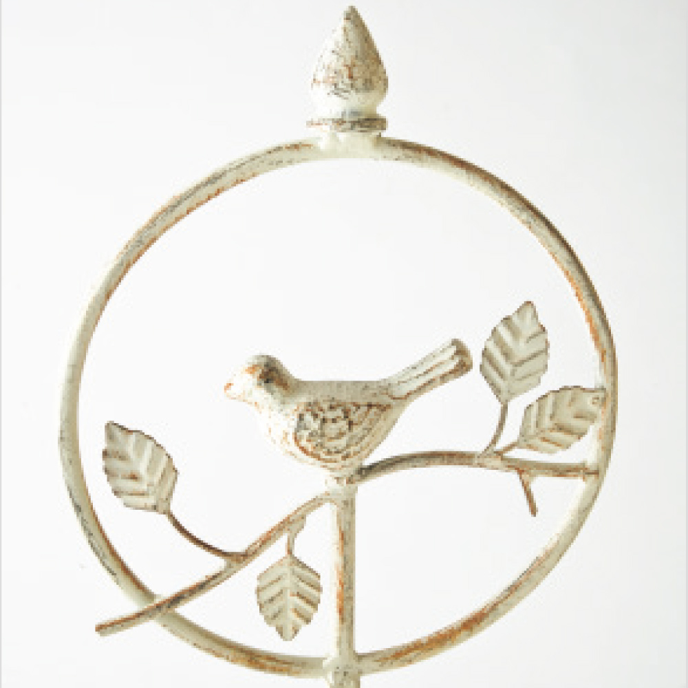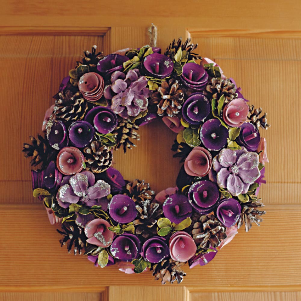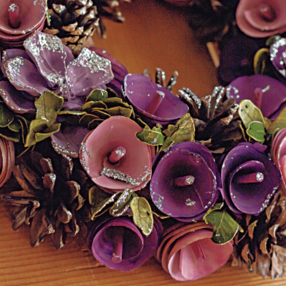 大人シックな2色のリーススタンドに飾って華やぎを紫とモーブピンクを基調に、ドライフラワーや木の皮などの天然素材をふんだんに使用したナチュラルなリース。小鳥付きのリーススタンドとも相性が抜群です。