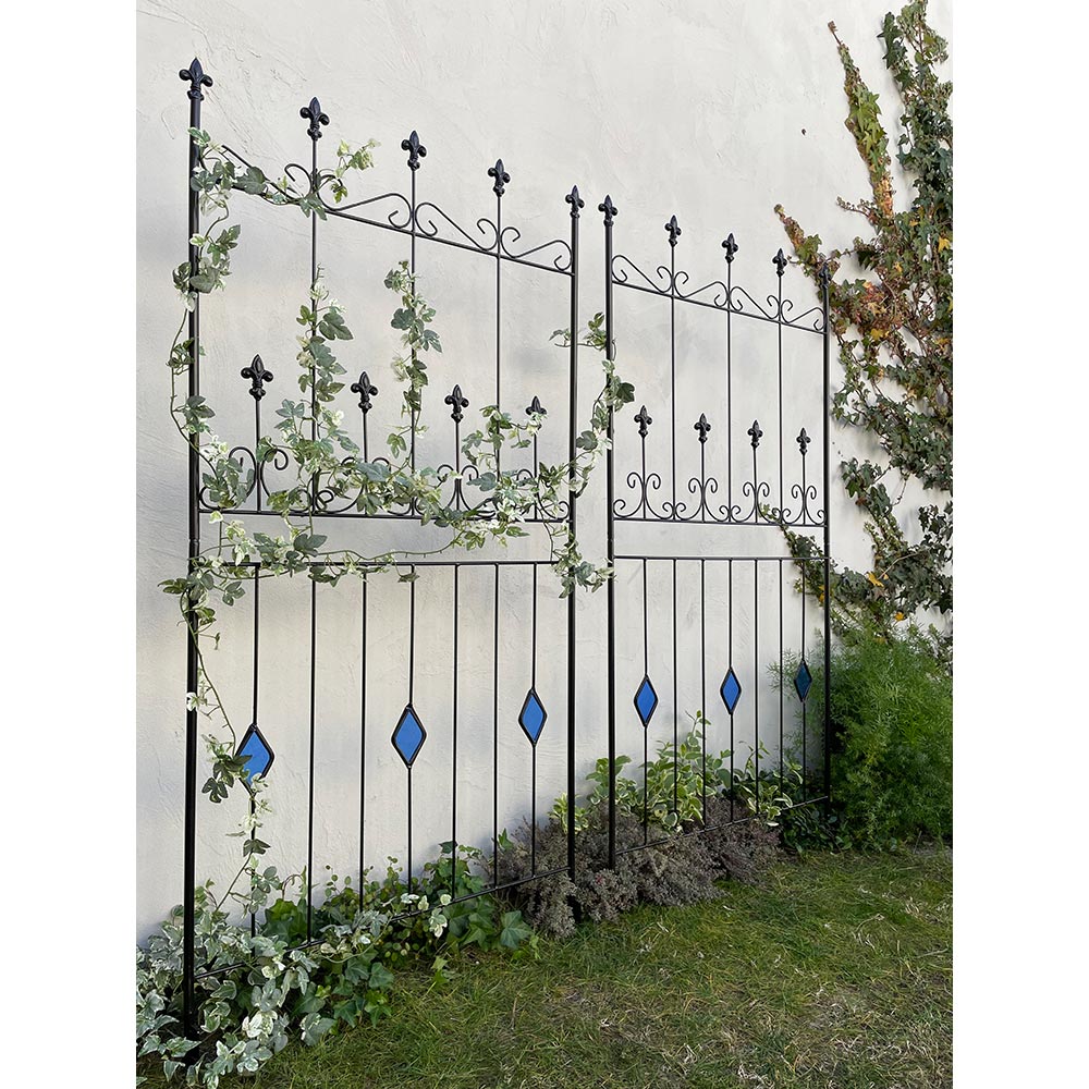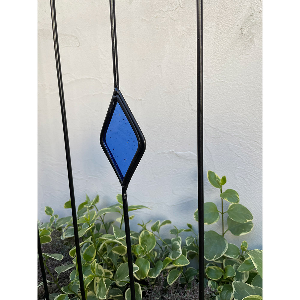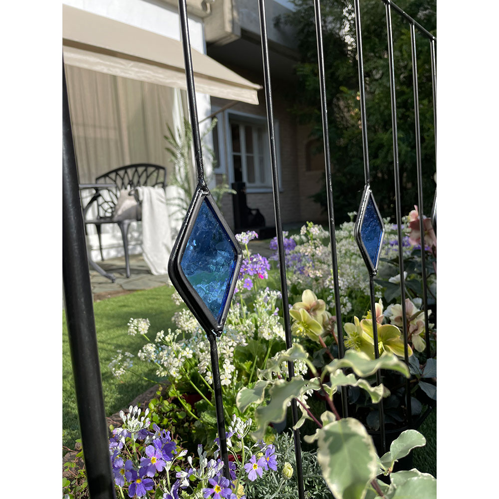 【影を楽しむガラスガーデン】アイアンフェンス×ステンドグラスの新しい組合せ。365日お花の無い季節でも楽しめるフェンス。※同色2枚組人気の【影を楽しむガラスガーデン】のシリーズ!〜365日お庭を楽しむ〜「植物の無い季節でも彩りを感じることが出来るお庭にしたい…!」そんな想いから、色のついたガラスで植栽の無い時期でもお庭に彩りをプラスするというアイデアを思いつきました。今までやったことのなかった線材のスチールにガラスを埋め込む…という技術。何度も何度も試作を重ね、遂に完成しました。ガーデン雑貨の中ではとても珍しい「スチール×ガラス」の組合せ。◆ガラスとアイアンの新しい組合せ・壁面や地面に映りこむステンドグラスの光を通した色影も美しく、お庭に降り注ぐ太陽の光加減によっての変化も楽しめます。・いつでもお庭に目をむけたくなるような自然を、影を、光を楽しんでいただける商品です。・どこで買ったの?と言われること間違いなし!・365日お庭の主役になるアイテム。お庭に置いて差し色としても。・植栽を誘引すると植栽の間からガラスがちらりと見えます。※ステンドグラスの特性上、中に細かい気泡が入っている場合がございます。