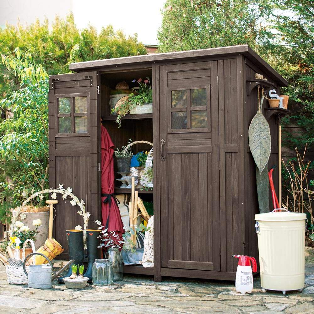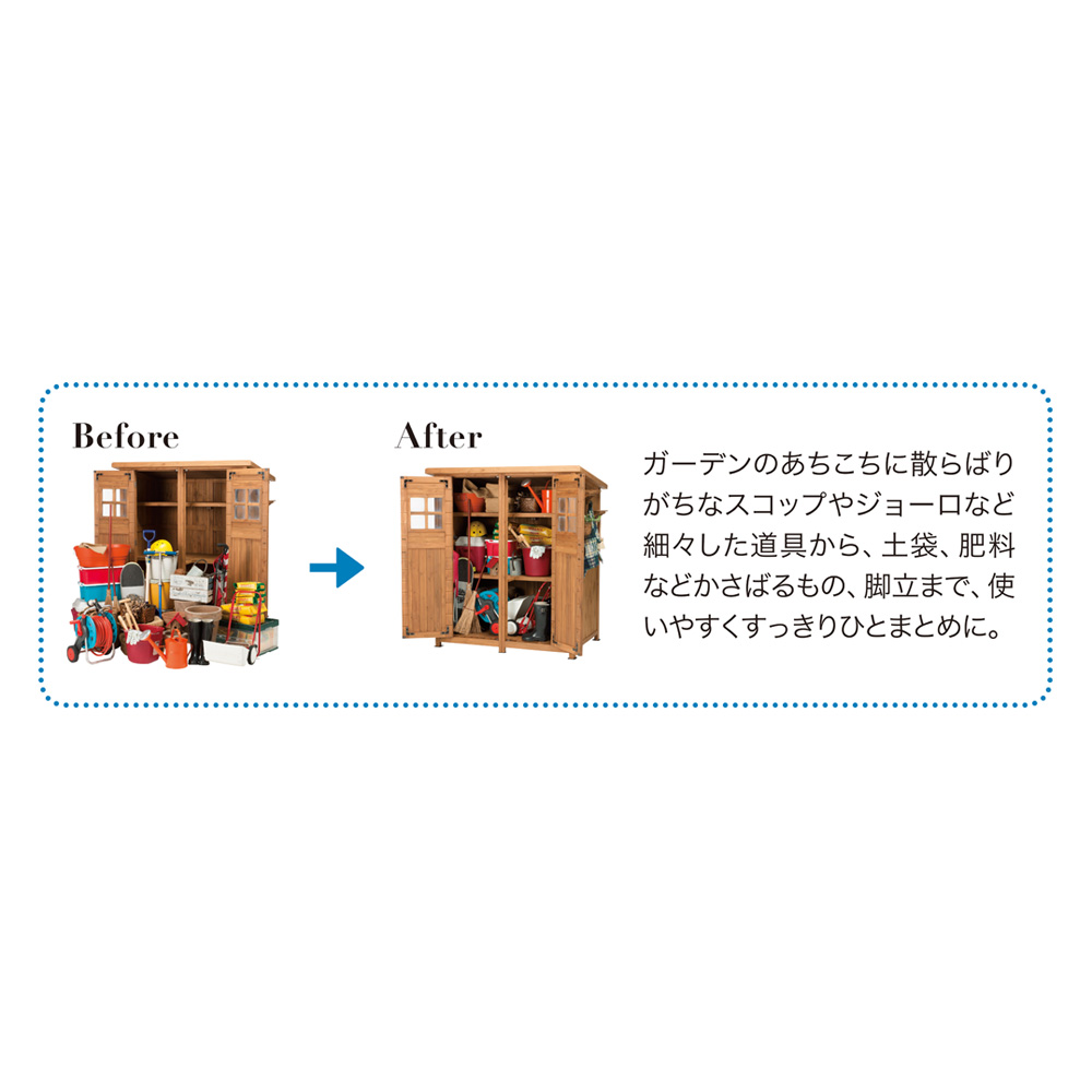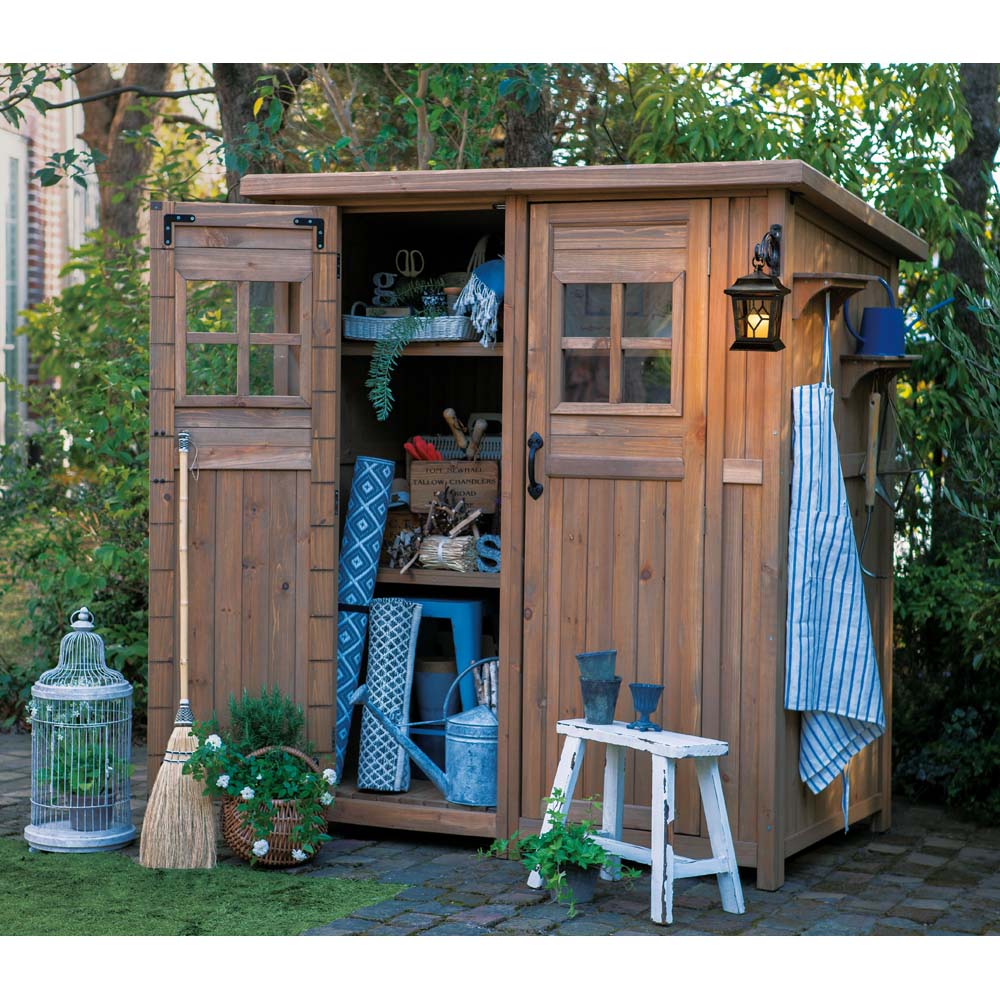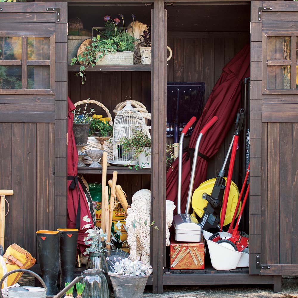 ※スチール製品は素材の特性上、経年変化でサビが発生致します。長くお使い頂くために、お届け直後の錆止め材の塗布をお薦めしております。 また、ご使用開始後も定期的なお手入れをお薦めします。(お手入れ方法&取り付け方法)ノスタルジックな小屋風物置。置くだけでおしゃれなお庭に。人気のライト付きタイプは夜のお庭もムーディに。天然木をふんだんに使ったカントリー調デザインで、庭の印象を左右する背景としての役割も充分に叶えます。小物から柄の長いツールまですっきり収納できる、頼もしい大容量シェッドです。お庭に置きたくなる、木製物置扉のアクリル製の小窓がポイント。山小屋のようなイメージはナチュラルガーデンにぴったり。こんなカントリー調デザインの物置なら、園芸用品の片付けまで楽しくなりそう。緑があふれる、ガーデニングを施したお庭にも素敵に溶け込む天然木製のロッカーです。自慢の収納力スコップやジョーロなどの道具のほか、用土、肥料など庭仕事のアイテムはかさばるのが悩み。大容量の物置ならまとめてすっきり片付けられます。ポリタンクも収納できる、頼れる収納力が自慢。使い勝手を考えた様々な工夫側面に取り付けられるツールフックが2個付属。フックのひさしは飾り棚としても活躍。天板は、雨の浸入を防ぐガルバリウム仕上げ。増え続けるガーデンツール、収納場所はまとめてこちらへ。長尺物の収納にも対応棚板は奥行きがすこし浅めの造り。扉と棚板の間のスペースには、柄の長いスコップやホウキ、高枝切りバサミなど、長尺のアイテムをすっきりと収めることができます。棚板構造は左右セパレート式。棚板のアレンジで、芝刈り機など長もの専用収納スペースもつくれます。お庭を引き立て、映える物置選びを増え続けるガーデン用品や培養土などの袋物、家周りで収納しにくいもの…物置なら収納は何でもおまかせ。でも、単なる収納場所というだけでなく、庭の印象を決める背景としての一面もお忘れなく。素材やデザインはもちろん、置くスペースや用途にもこだわって選べば、より自分らしいガーデンがかなえられます。
