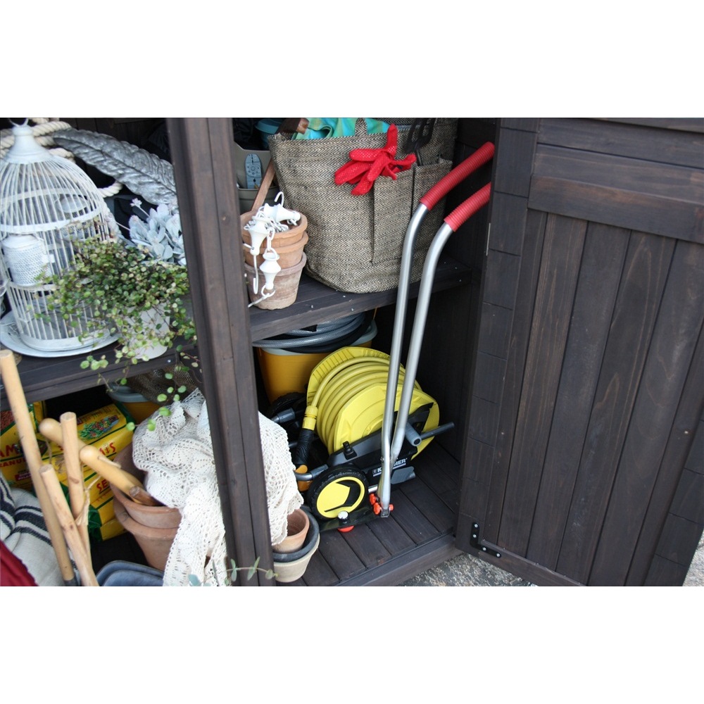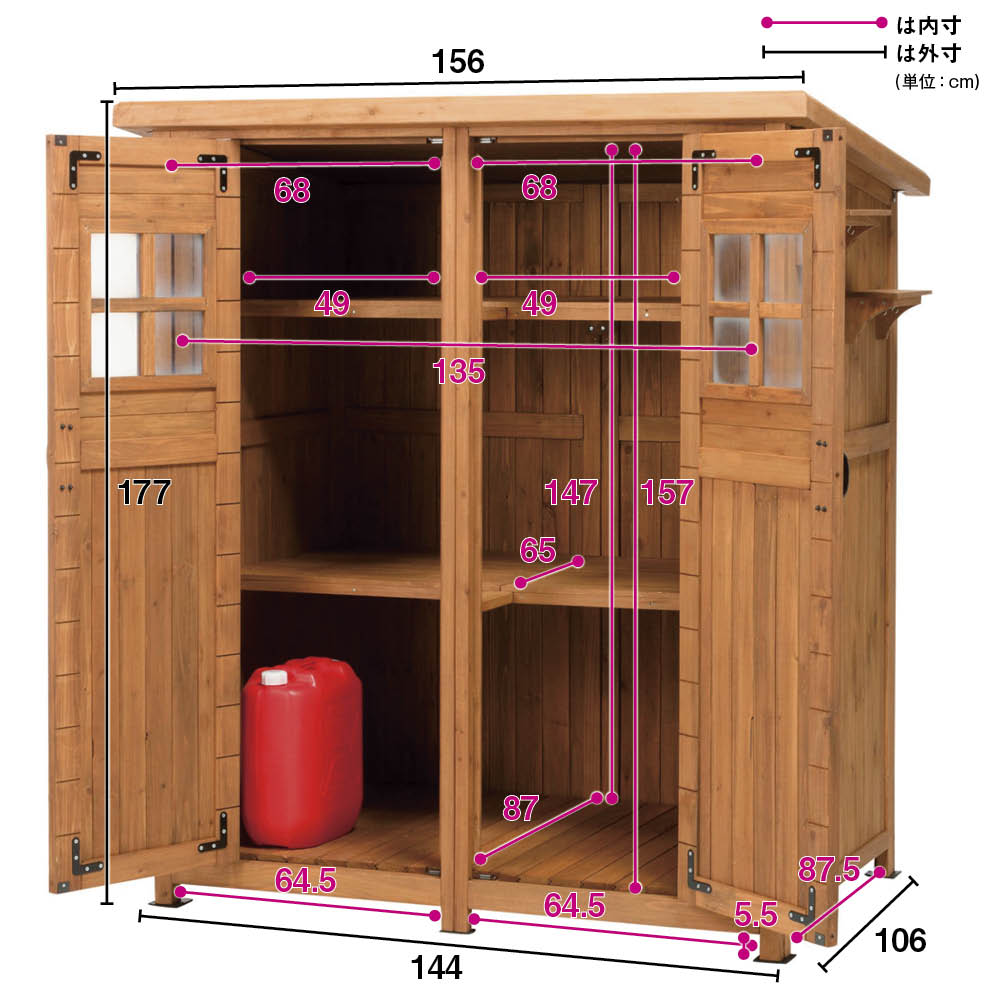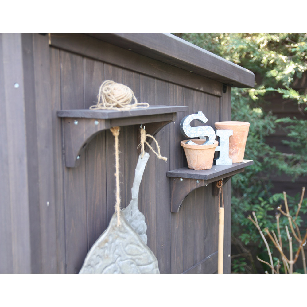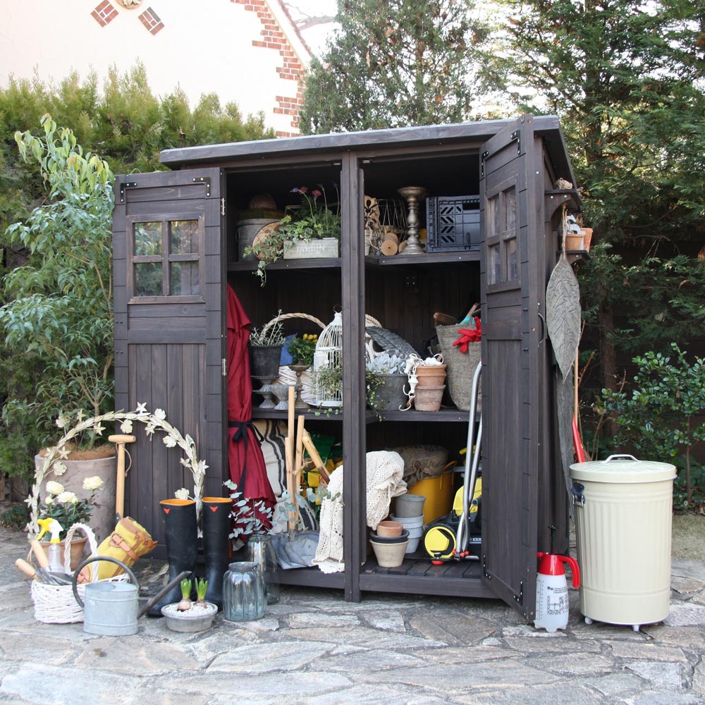 ※スチール製品は素材の特性上、経年変化でサビが発生致します。長くお使い頂くために、お届け直後の錆止め材の塗布をお薦めしております。 また、ご使用開始後も定期的なお手入れをお薦めします。(お手入れ方法&取り付け方法)ノスタルジックな小屋風物置。置くだけでおしゃれなお庭に。人気のライト付きタイプは夜のお庭もムーディに。天然木をふんだんに使ったカントリー調デザインで、庭の印象を左右する背景としての役割も充分に叶えます。小物から柄の長いツールまですっきり収納できる、頼もしい大容量シェッドです。お庭に置きたくなる、木製物置扉のアクリル製の小窓がポイント。山小屋のようなイメージはナチュラルガーデンにぴったり。こんなカントリー調デザインの物置なら、園芸用品の片付けまで楽しくなりそう。緑があふれる、ガーデニングを施したお庭にも素敵に溶け込む天然木製のロッカーです。自慢の収納力スコップやジョーロなどの道具のほか、用土、肥料など庭仕事のアイテムはかさばるのが悩み。大容量の物置ならまとめてすっきり片付けられます。ポリタンクも収納できる、頼れる収納力が自慢。使い勝手を考えた様々な工夫側面に取り付けられるツールフックが2個付属。フックのひさしは飾り棚としても活躍。天板は、雨の浸入を防ぐガルバリウム仕上げ。増え続けるガーデンツール、収納場所はまとめてこちらへ。長尺物の収納にも対応棚板は奥行きがすこし浅めの造り。扉と棚板の間のスペースには、柄の長いスコップやホウキ、高枝切りバサミなど、長尺のアイテムをすっきりと収めることができます。棚板構造は左右セパレート式。棚板のアレンジで、芝刈り機など長もの専用収納スペースもつくれます。お庭を引き立て、映える物置選びを増え続けるガーデン用品や培養土などの袋物、家周りで収納しにくいもの…物置なら収納は何でもおまかせ。でも、単なる収納場所というだけでなく、庭の印象を決める背景としての一面もお忘れなく。素材やデザインはもちろん、置くスペースや用途にもこだわって選べば、より自分らしいガーデンがかなえられます。