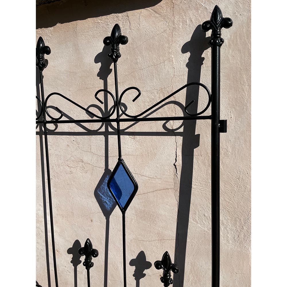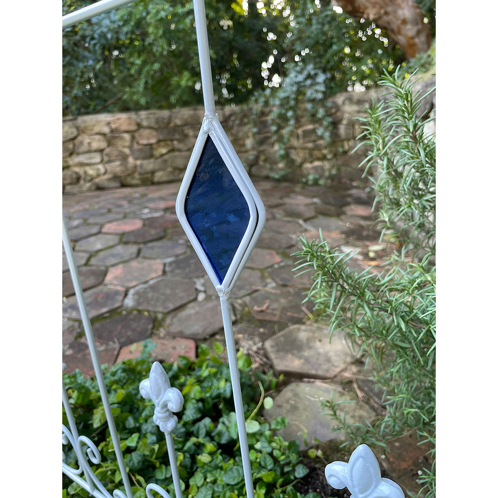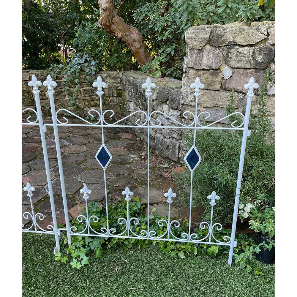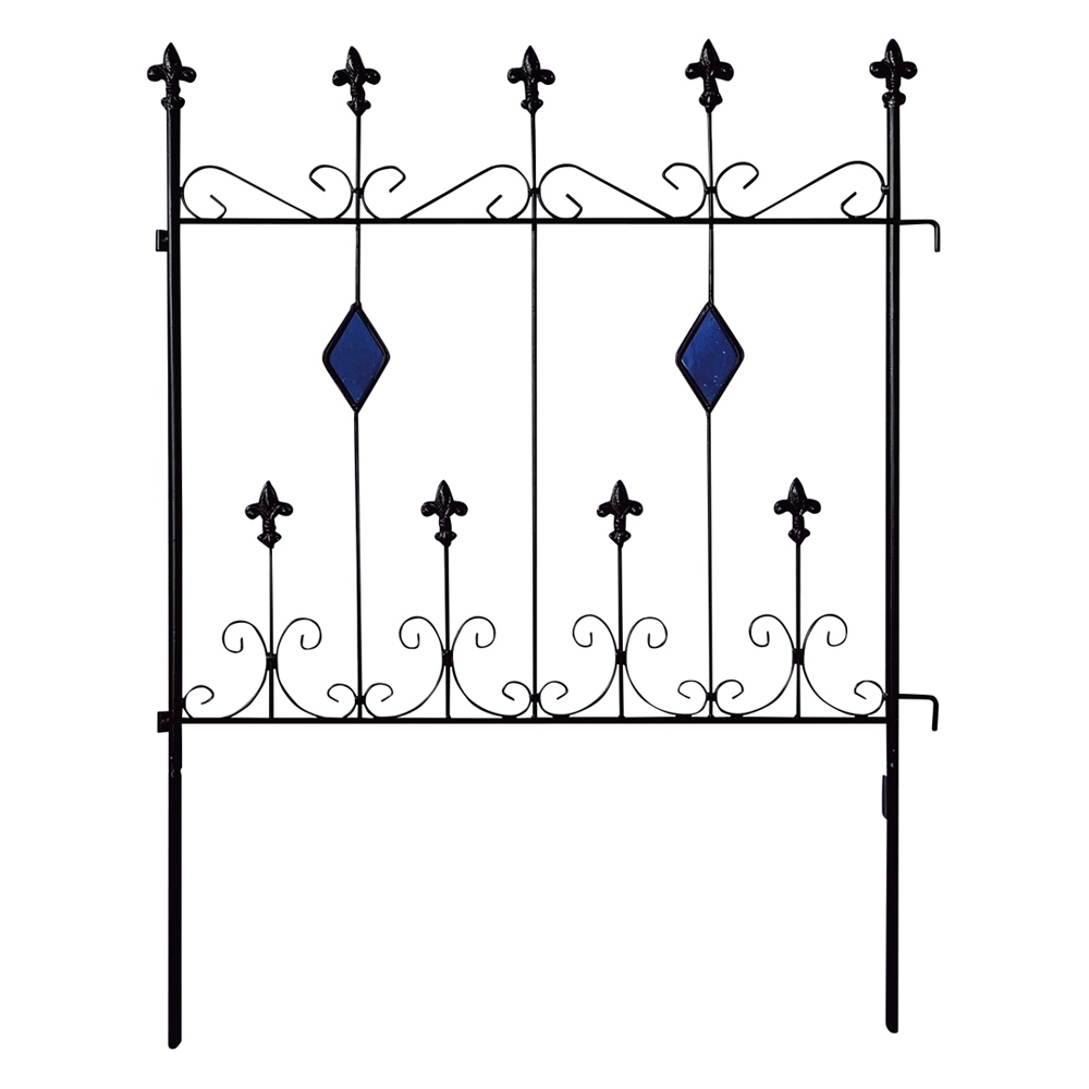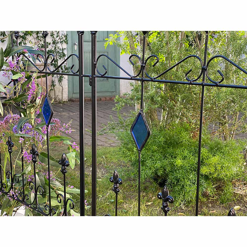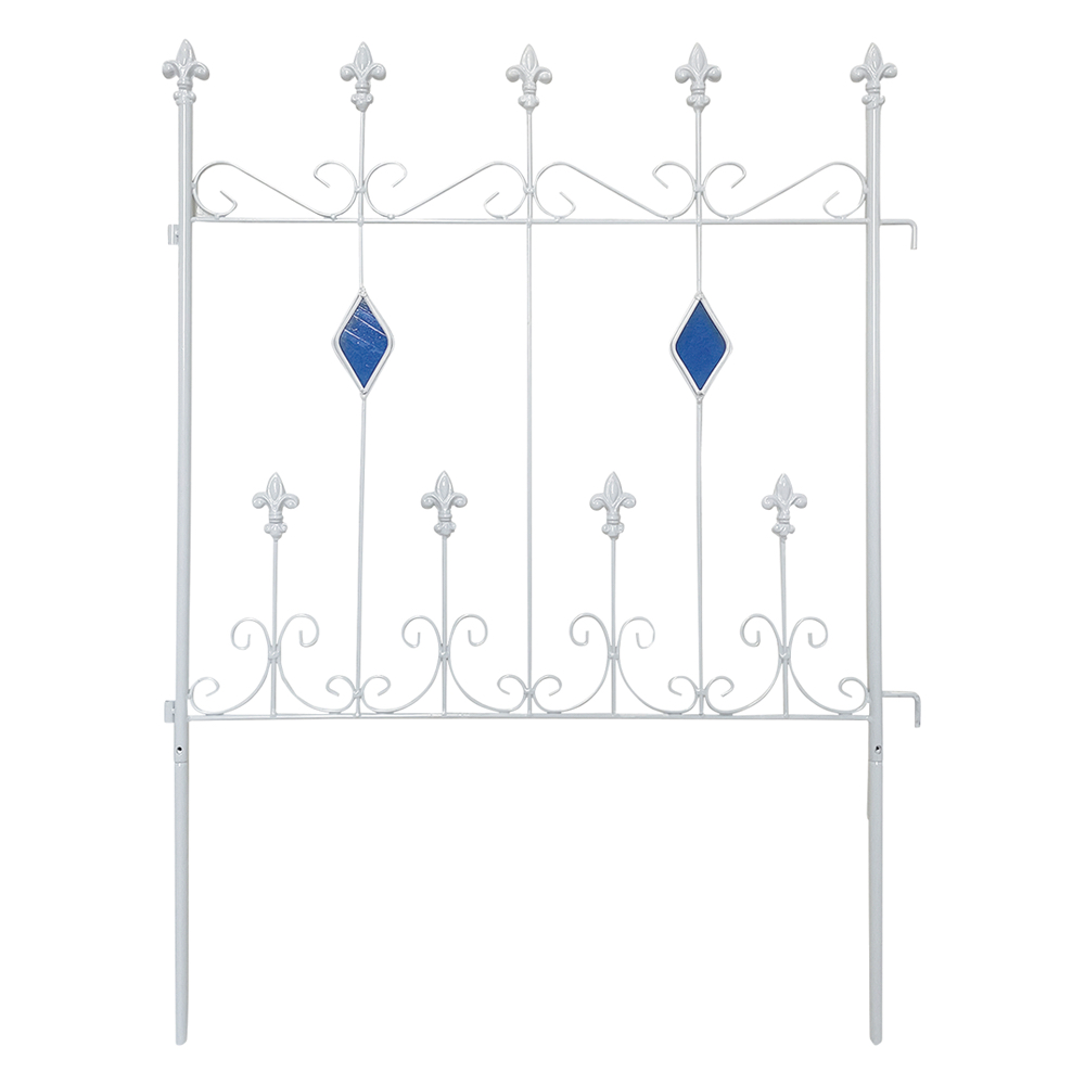 【影を楽しむガラスガーデン】アイアンフェンス×ステンドグラスの新しい組合せ。365日お花の無い季節でも楽しめるフェンス。※同色2枚組人気の【影を楽しむガラスガーデン】のシリーズ!〜365日お庭を楽しむ〜「植物の無い季節でも彩りを感じることが出来るお庭にしたい…!」そんな想いから、色のついたガラスで植栽の無い時期でもお庭に彩りをプラスするというアイデアを思いつきました。今までやったことのなかった線材のスチールにガラスを埋め込む…という技術。何度も何度も試作を重ね、遂に完成しました。ガーデン雑貨の中ではとても珍しい「スチール×ガラス」の組合せ。◆ガラスとアイアンの新しい組合せ・壁面や地面に映りこむステンドグラスの光を通した色影も美しく、お庭に降り注ぐ太陽の光加減によっての変化も楽しめます。・いつでもお庭に目をむけたくなるような自然を、影を、光を楽しんでいただける商品です。・どこで買ったの?と言われること間違いなし!・365日お庭の主役になるアイテム。お庭に置いて差し色としても。・植栽を誘引すると植栽の間からガラスがちらりと見えます。※ステンドグラスの特性上、中に細かい気泡が入っている場合がございます。