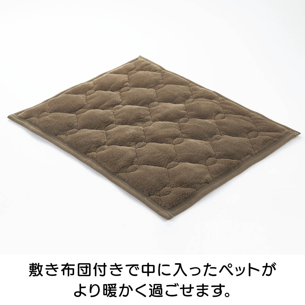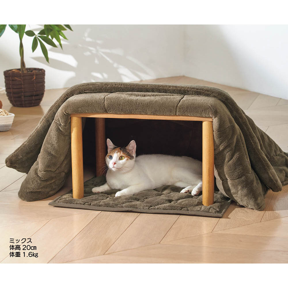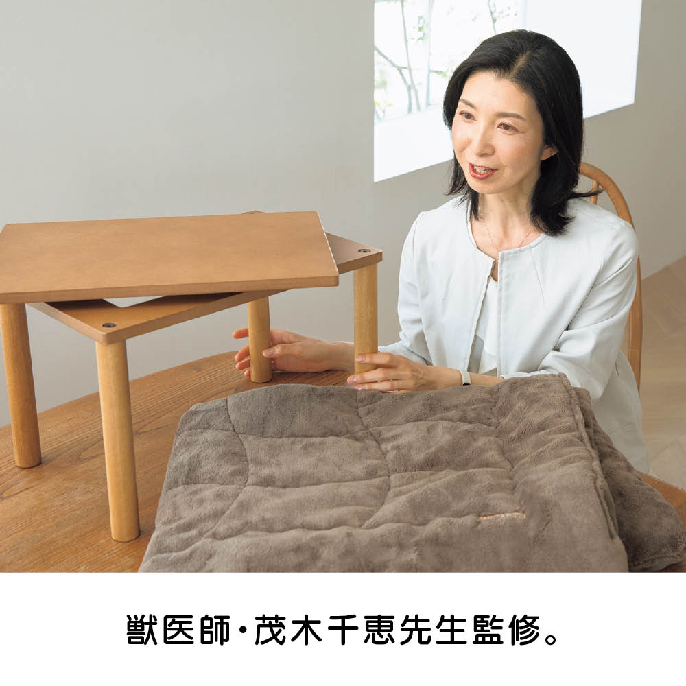 大切なペットに寒い思いをさせない、dinosの大ヒット寝具「ヒートループ(R)」素材でつくったあったかこたつ。こたつ本体と掛け布団、敷き布団の3点セット。家族の笑顔が増えて、SNS映えする写真もたくさん撮れそう。電気不要で、熱源を使っていないから人が留守の間も安心です。大切なペットに寒い思いをさせない、dinosの大ヒット寝具「ヒートループ(R)」素材で作ったあったかこたつ。こたつ本体と掛け布団、敷き布団の3点セット。家族の笑顔が増えて、SNS映えする写真もたくさん撮れそう。電気不要で人が留守の間も安心。※ヒーターは付いていません。こたつ本体・掛け布団・敷き布団のより暖かな3点セットをご用意しました。やぐらの上に掛け布団をかけて、天板を載せるだけ。やぐら上部は四角い穴が開いており、天板裏の凸形状がしっかりはまって掛け布団がズレにくくなっています。掛け布団と敷き布団の中わたには、ヒートループ(R)わた、中材に遮熱アルミ生地を使用。中わたが吸湿発熱するので、電気を使わなくてもこたつの中はあったか。汚れやニオイが気になったら、洗濯ネットに入れて洗濯機で手軽に洗えます。洗ってもヒートループ(R)のあったか効果は変わりません。裏面には滑り止め付きなので、ペットが出入りしたり、こたつの中で動いても、敷き布団やこたつがズレにくくなっています。茂木先生コメント「ペットたちは野生の習性を残しているので、周りが薄暗かったり、何かに囲まれていたり、やわらかく暖かい感覚が大好きです。このこたつは、イヌやネコの本能に訴えかける安心感を演出できると考えています。さわった瞬間に暖かいとか、自分の肌と同じような温度を感じられるというところは、ペットにとって最高の感触です。隣に同じような仲間がいる感覚になり、すごく安心するのではないでしょうか。」■茂木 千恵 先生プロフィール東京大学大学院農学生命科学科獣医学博士課程卒。獣医師。博士(獣医学)。(株)モンパニエ・動物臨床行動学研究室主宰。藤田医科大学医学部客員講師。現在、都内動物病院で問題行動のカウンセリングを行う。「猫にいいこと大全」、「動物行動学+猫マンガ ニャン学」、「マンガ動物行動学 犬の気持ちとしぐさがよくわかる!」(本:いずれも主婦の友社)監修。犬と猫の問題行動を対象とした執筆、研究教育活動を行う。フジテレビ等TV番組監修多数。