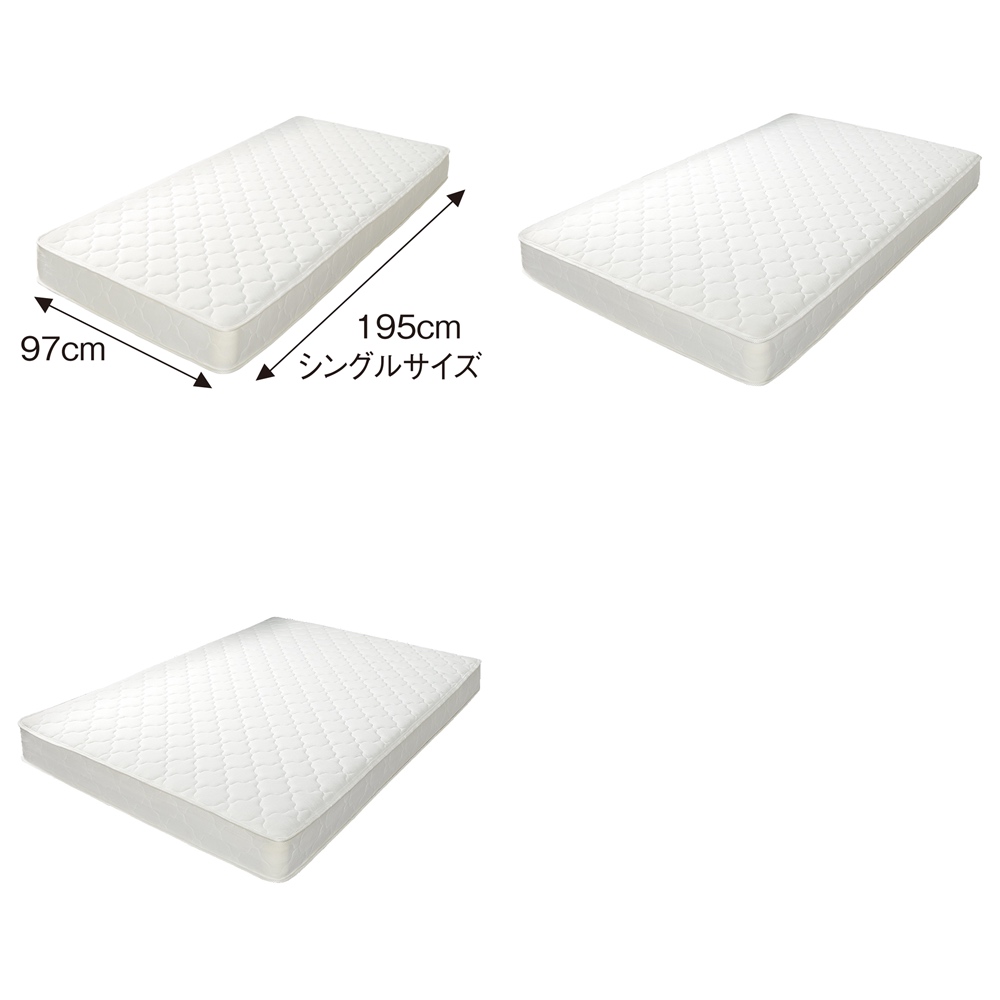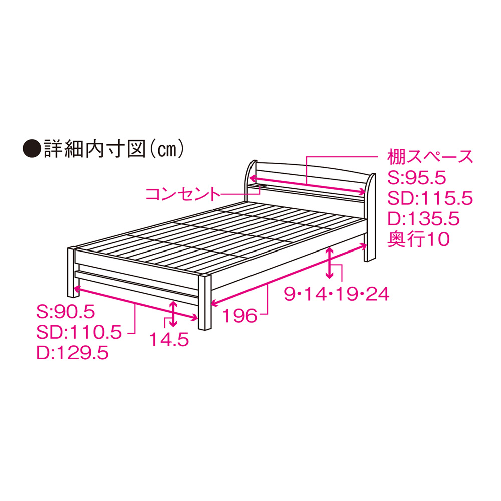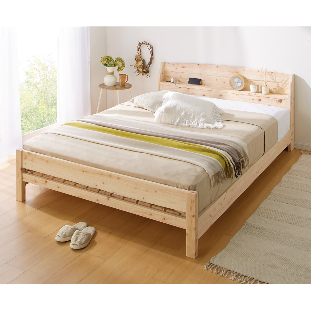 無塗装の国産ひのきを使用し、香りも心地よい天然素材のベッドフレーム。ヘッドボードに小棚とコンセントがあり使いやすさもバッチリ。サイズはシングル・セミダブル・ダブルをご用意。ベッドにぴったりなポケットコイルマットレスがセット。国産のひのき天然木を使用した国内一貫生産のひのきベッドフレームフレームもすのこ板部もひのき天然木を使用しました。すのこ板は4分割仕様です。(すのこ板の桟木は強度を保つため積層合板を使用)ひのき材の香りと温もりが魅力です。無塗装なので、使うほどに色が変化し、味わいが増してきます。※お届けした際、匂いが強くしますが、ひのき材の香りです。少しずつ香りは弱まりますが、予めご承知おきください。便利な棚付きヘッドボードヘッドボードには、目覚まし時計や携帯電話、本などが置ける棚付きです。また、向かって棚の左端には携帯電話の充電にも便利な電源コンセント(2口コンセント 計1500W)が付いています。コンセントは棚の上部についております。棚のサイズは、シングル …幅95.5×奥行10cm セミダブル…幅115.5×奥行10cm ダブル …幅135.5×奥行10cmベッドの高さが4段階に調節できます寝る高さ(床面高さ)をサイドフレームの組み立て位置の調節によって変えることができます。厚みのあるスプリング式マットレスを載せる場合は、サイドフレームを低く取り付け、布団で寝る場合にはサイドフレームを高く取り付けます。床面高さは21・26・31・36cmと調節可能。サイドフレーム下の高さは9・14・19・24cmとなります。高さによっては、樹脂製の衣装ケースなどをベッド下に収納することができます。通気性のいいすのこ仕様梅雨の季節のカビ・湿気対策におすすめベッド。床面には通気性のいいすのこを採用。すのこもひのきを使用しております。床面サイズは、シングル …幅100.5×長さ196cm セミダブル…幅120.5×長さ196cm ダブル …幅139.5×長さ196cm「ウッドデザイン賞2018」受賞商品ウッドデザイン賞とは?…木の良さや価値を再発見させる、優れた製品や取り組みに対し与えられる賞です。当商品は木を使って人の心を豊かにするハートフルデザイン部門にて入賞しました。≪高密度ポケットコイルマットレス付き≫厚み約19cmとボリュームのある仕上がりで、通気性のある立体メッシュ生地を4側面に使用。伸縮性の高いニット生地で包むことで、しっかりとしたポケットコイルの寝心地に適度な柔らかさを加えました。袋詰めされた個々のポケットコイルが独立して動くため、身体のラインに沿ってしっかり点で支えます。身体をしっかり受け止め、包み込まれるようなホールド感。体圧分散に優れ、横揺れが少ないので、横向きや二人で寝られる方にオススメです。ロール状の梱包を解けば、あっという間にマットレスが復元されます。コンパクトな包装を実現することにより、入り口が狭いお宅でもラクラク搬入が可能です。(※マットレスはロール状態開封後は返品できません。)(※ベッド本体と一緒にご購入した場合、先にベッド本体を組み立て、最後にマットレスのロール状態を開封してください。)※「高密度ポケットコイルマットレス」の開封方法について、上の動画で詳しく紹介しています。〜ベッドの選び方についての特集はこちら〜ベッドの選び方〜暮らしに合わせた大きさ選びのポイントとフレームの種類について〜