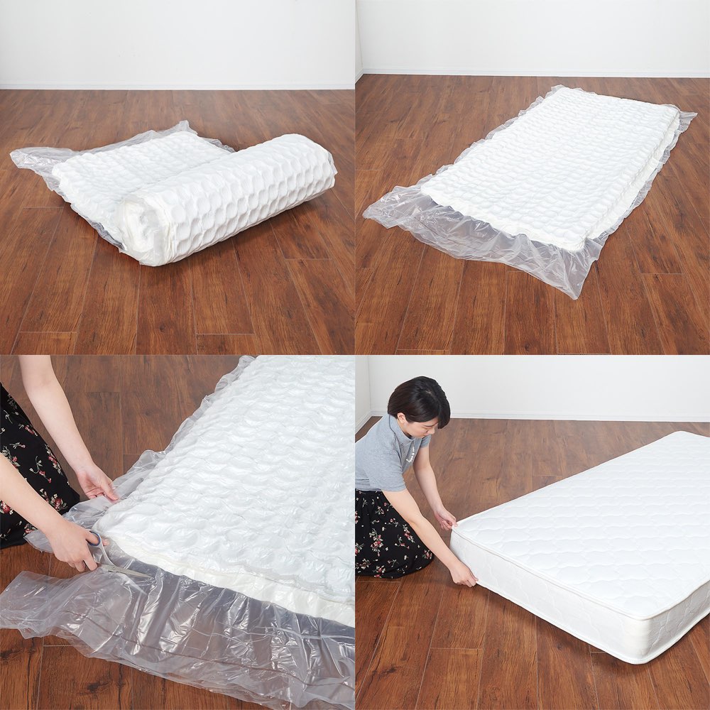 (写真左)ロール状の梱包を解けば、あっという間にマットレスが復元されます。ラクラク搬入が可能です。(※マットレスはロール状態開封後は返品できません。) (写真右)袋詰めされた個々のポケットコイルが独立して動くため、体のラインに沿ってしっかり点で支えます。