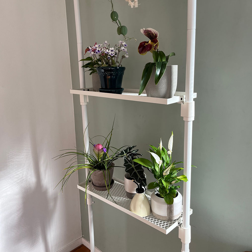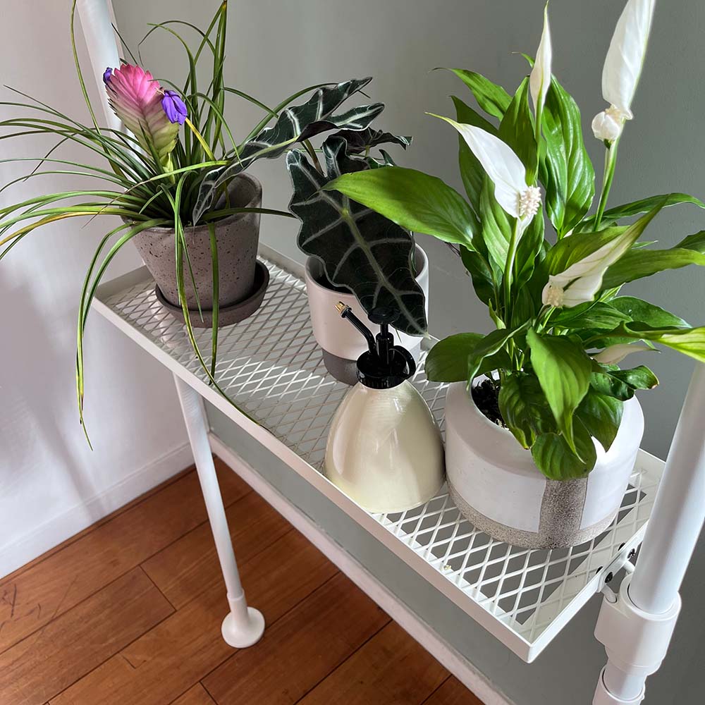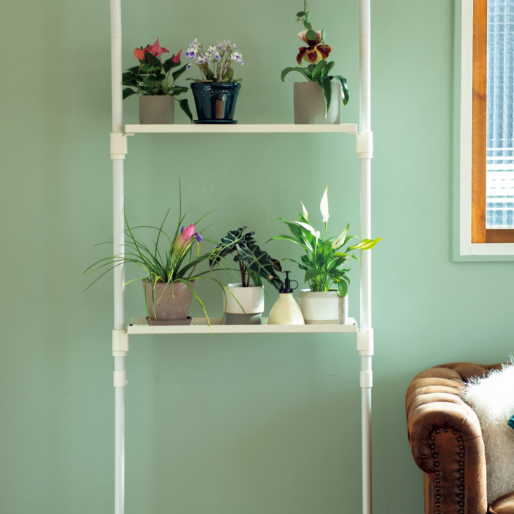 掛けて置いて、涼しげボタニカル空間を演出お部屋でグリーンを楽しみたい!でも吊り下げる場所がないし壁に穴は開けたくない!という願いに応えたアイテム。省スペースで吊り鉢を飾れ、自分好みにカスタマイズできます。つっぱり式のポールにフック・プレート・シェルフを取り付けるだけで完成! 育成ライトを併用すれば日照量が足りない室内でも観葉植物や多肉植物、室内用草花の育成をサポートします。