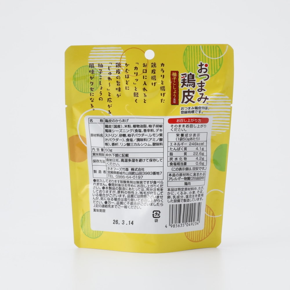 - > ネオフーズ竹森 おつまみ鶏皮 柚子こしょう風味 50g