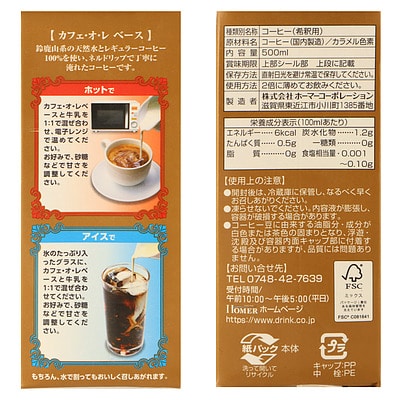 - > ホーマー カフェオレベース 無糖 500ml×12本