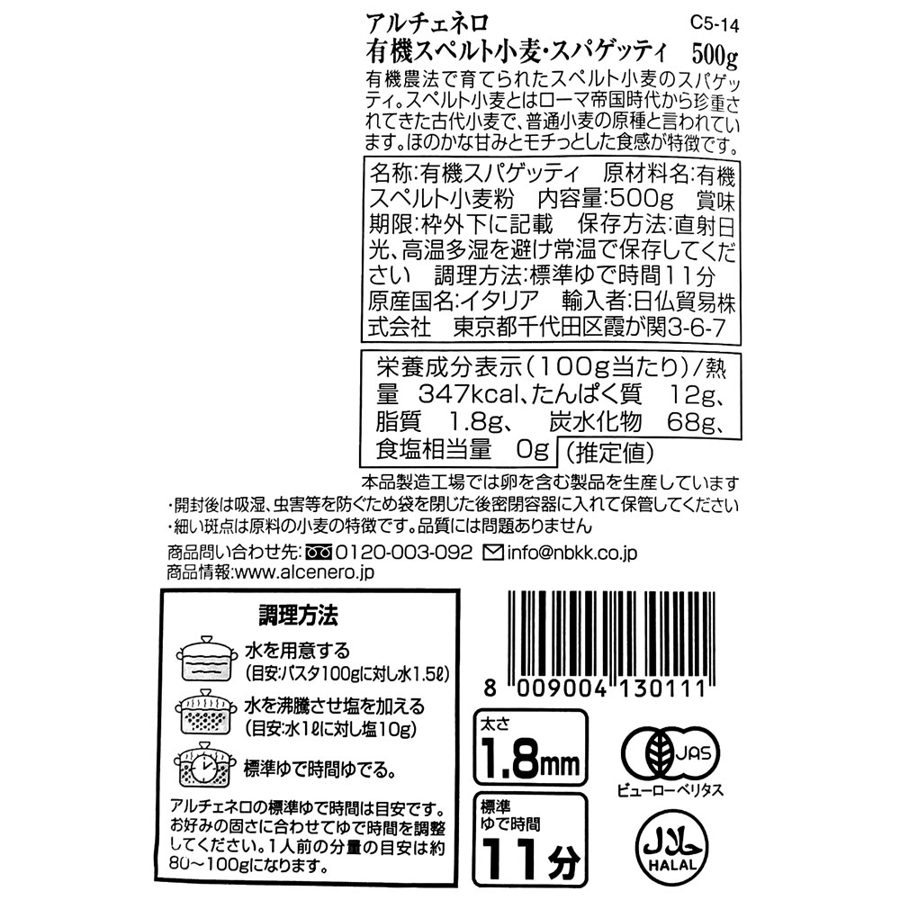 - > アルチェネロ 有機スペルトスパゲティー 500g×3個