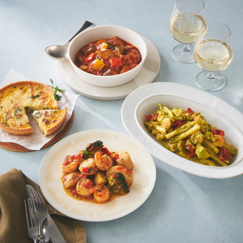 ワインと好相性の4種のメニューを組み合わせたセット。チーズのコクあるキッシュに、ハーブの香り豊かなシーフード料理、ジェノバソースが美味しいパスタに野菜の甘みと旨みを閉じ込めたラタトゥイユ。温めるだけで、ビストロのような本格的美味しさを手軽に楽しめます。※価格は送料込価格です。
