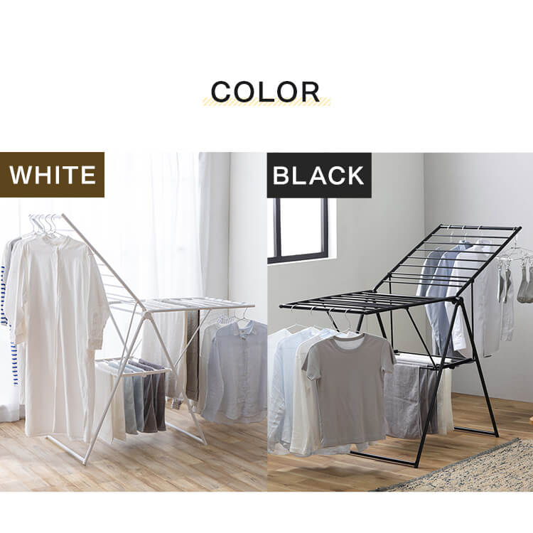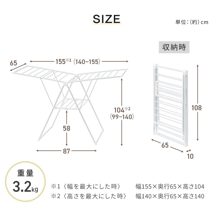 ●商品サイズ(cm)幅を最大にした時:幅約155×奥行約65×高さ約104高さを最大にした時:幅約140×奥行約65×高さ約140収納時:幅約10×奥行約65×高さ約108●商品重量約3.2kg●耐荷重(約)全体:17.2kg上パイプ1本あたり:1kg下パイプ1本あたり:0.2kg※耐荷重は測定値であり、保証値ではありません●一度に干せる目安シャツ等16枚、バスタオル4枚、タオル6枚、小物20枚※ハンガーとピンチハンガーを使用●主要材質パイプ:スチール(エポキシ樹脂塗装)プラパーツ:ABS樹脂、ポリプロピレン