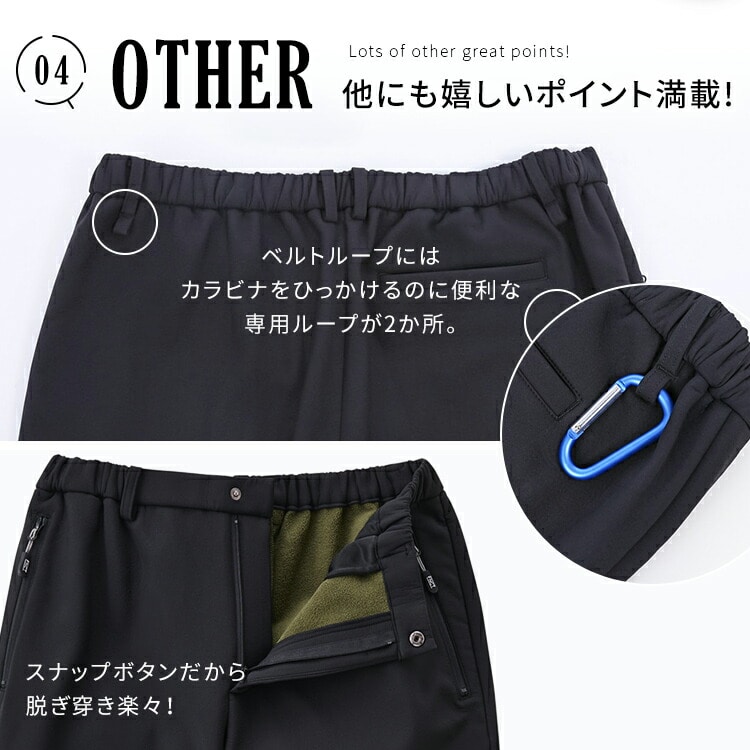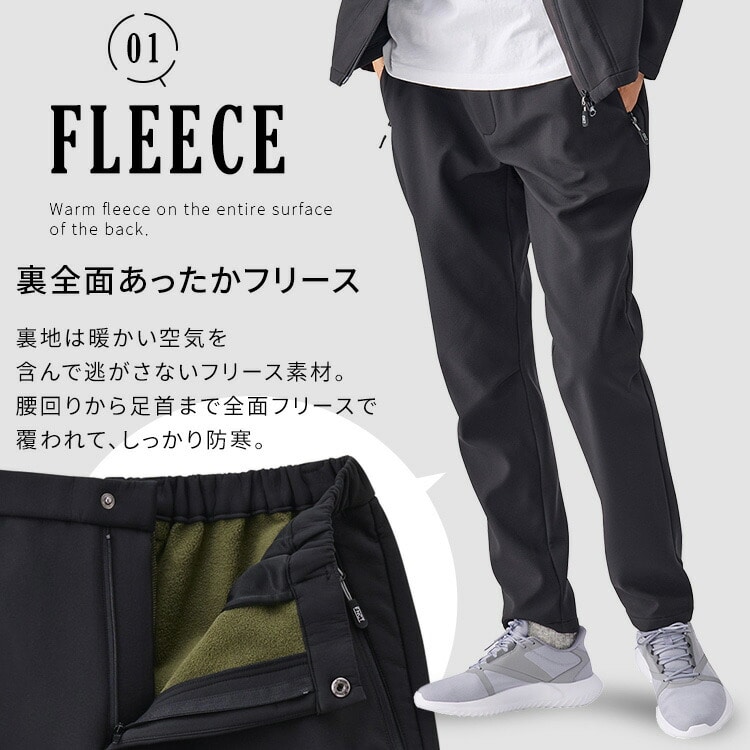 腰回りから足首まで全面フリースで覆われて、しっかり防寒。