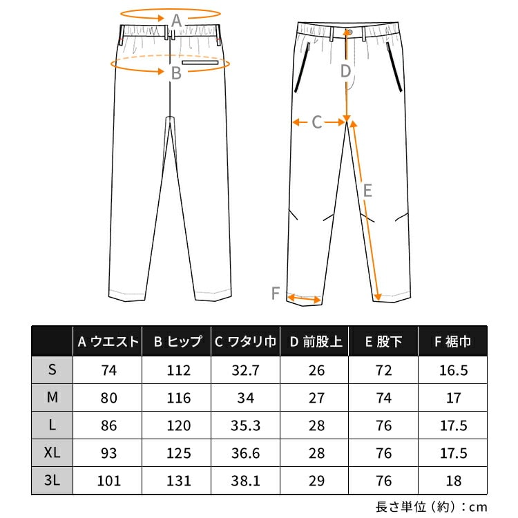 ●製品サイズ(ウエスト約/ヒップ約/ワタリ幅約/前股上約/股下約/裾幅約[cm])S:74/112/32.7/26/72/16.5M:80/116/34/27/74/17L:86/120/35.3/28/76/17.5XL:93/125/36.6/28/76/17.53L:101/131/38.1/29/76/18※寸法は目安となります。商品・測定方法によって誤差が生じる場合がございますので、あらかじめご了承ください。●材質ポリエステル100%※洗濯時は洗濯ネットをご使用ください。※脱水は短時間で行ってください。※他の製品と一緒に洗わず、単独で洗ってください。※漬け置き洗いは避けてください。※蛍光増白剤配合洗剤は使用しないでください。※ファスナー、ボタン、面ファスナー、ベルトなどがある場合は、閉じて洗ってください。