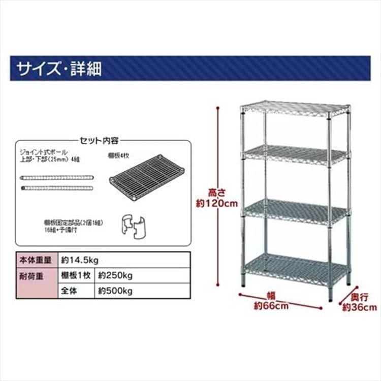 ●商品サイズ(cm)幅約66×奥行約36×高さ約120●棚板内寸(cm):幅約58.8×奥行約28.8●耐荷重棚板1枚あたり:約250kg、全体:約500kg●主要材質棚板・ポール:スチール(クロームメッキ)固定部品:ABS樹脂●メーカー名アイリスオーヤマ(IRIS OHYAMA)
