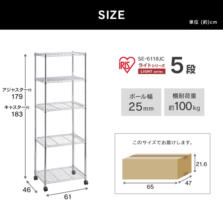 ●製品サイズ(cm)●幅約61×奥行約46×高さ(アジャスター含む)179●耐荷重●棚板(1枚あたり):100kg【全体】アジャスター使用時(静止時):500kgキャスター使用時(静止時):300kgキャスター使用時(移動時):100kg