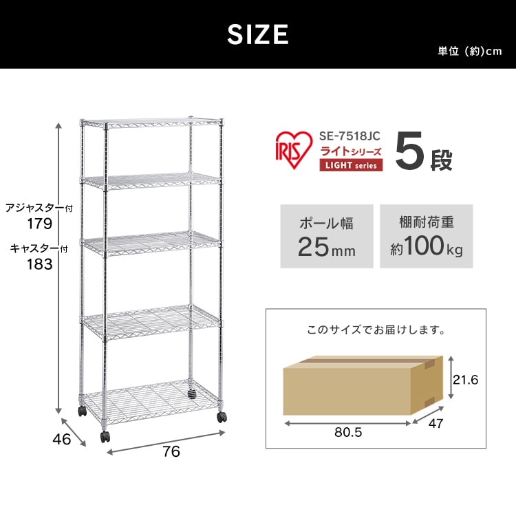 ●製品サイズ(cm)●幅約76×奥行約46×高さ(アジャスター含む)179●耐荷重●棚板(1枚あたり):100kg【全体】アジャスター使用時(静止時):400kgキャスター使用時(静止時):300kgキャスター使用時(移動時):100kg