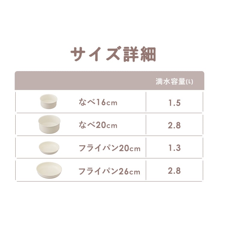 2026/1/27 フライパンリニューアルしました 【セラミックカラーパン5点セット:CC-5S】●セット内容フライパン20cm、フライパン26cm、なべ16cm、ガラスふた16cm、マルチハンドル●対応熱源IH対応(IH200V、IH100V)、ガス火、ラジエントヒーター、その他の電気ヒーター※電子レンジ、オーブン、食洗機では使用できません。【フライパン20cm/26cm】 ●表面加工(内側/外側) セラミック塗装加工/(底面を除く)焼付塗装加工 ●材料の種類 本体:アルミニウム合金 はり底:ステンレス鋼(クロム16%) 底の厚さ:3.2mm(はり底含む) ●寸法 20cm/26cm ●満水容量 1.3L/2.8L 【なべ16cm】●表面加工(内側/外側)セラミック塗装加工/(底面を除く)焼付塗装加工●材料の種類本体:アルミニウム合金はり底:ステンレス鋼(クロム16%)底の厚さ:2.5mm(はり底含む)●寸法16cm●満水容量1.5L【ガラスふた16cm】●品名強化ガラス製器具●強化の種類前面物理強化●ゴム部シリコーン樹脂(耐熱温度約220℃)【マルチハンドル】●材質樹脂部(上/下):ナイロン(耐熱温度150℃)/フェノール樹脂(耐熱温度150℃)金属部:ステンレス鋼ゴム部:シリコーン樹脂(耐熱温度約220℃)※必ず中火以下で、調理面には油をひいてご使用ください。※調理後の急激な冷却は避けてください。※金属製の調理器具のため電子レンジではご使用いただけません。※食器洗い乾燥機での洗浄、乾燥はしないでください。