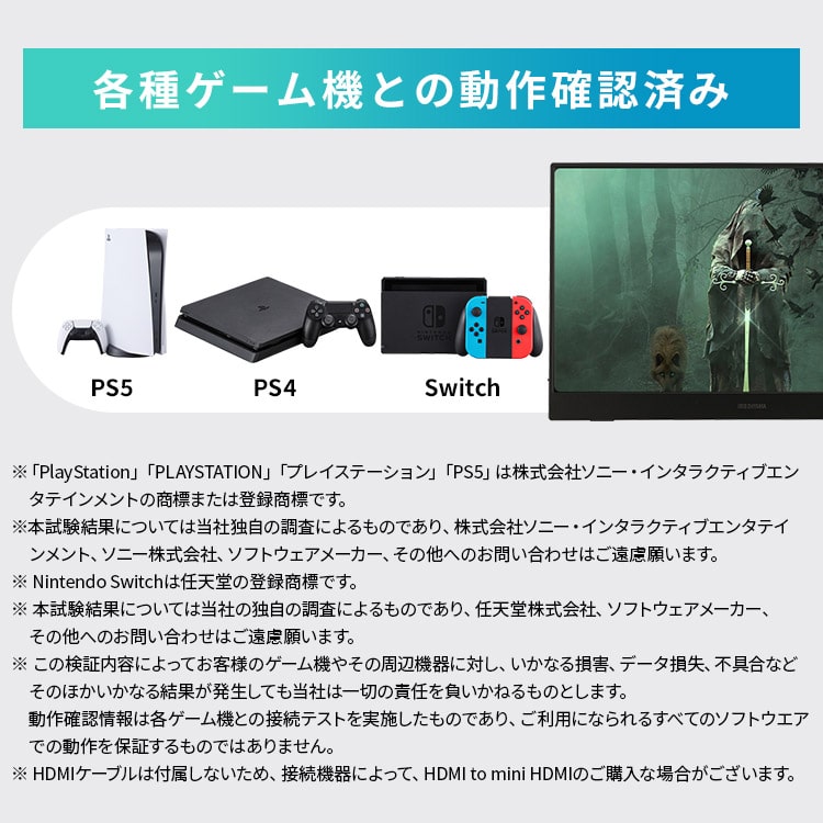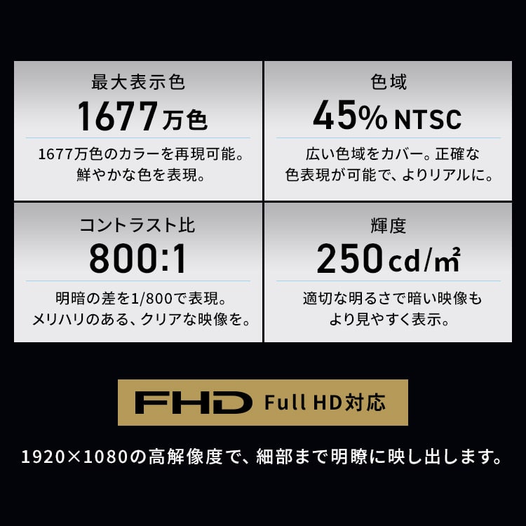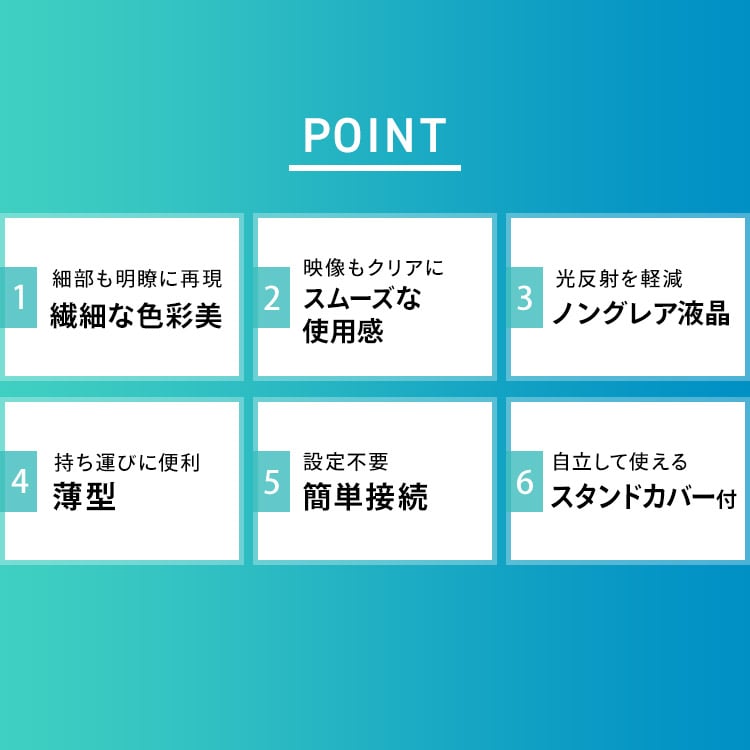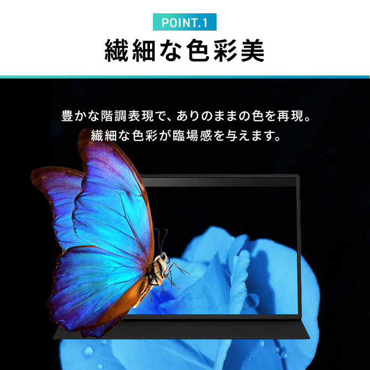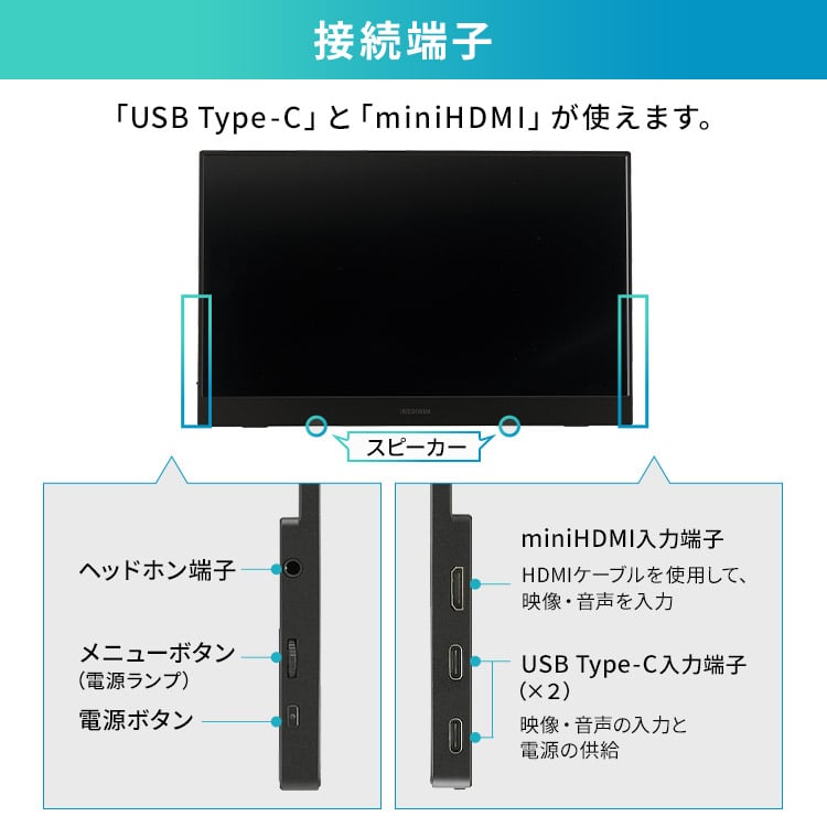 仕事で大活躍!テレワークや出張に便利なポータブルモニターです。◆薄型・高画質薄型設計で持ち運びに便利。スタンドカバー付きで、移動中も画面を守ります。豊かな階調表現で、ありのままの色を再現。最大表示色1677万色。角度が変わっても、ほぼ色味が変わらない忠実な色再現。映像の発色もやわらかく、目にやさしい非光沢タイプ。◆設定不要の簡単接続難しい設定は不要。電源を入れて接続すればすぐに使えます。汎用性の高い接続端子USB Type-C・Mini HDMIに対応。PCと繋げばデュアルモニターに。画面を広々使えて、仕事効率UP。◆スタンドカバー付きカバーとして液晶の傷・汚れを防止するのはもちろん、使用時はモニターを立てて使用できます。