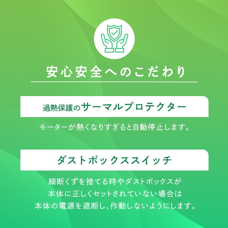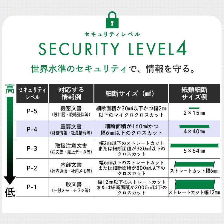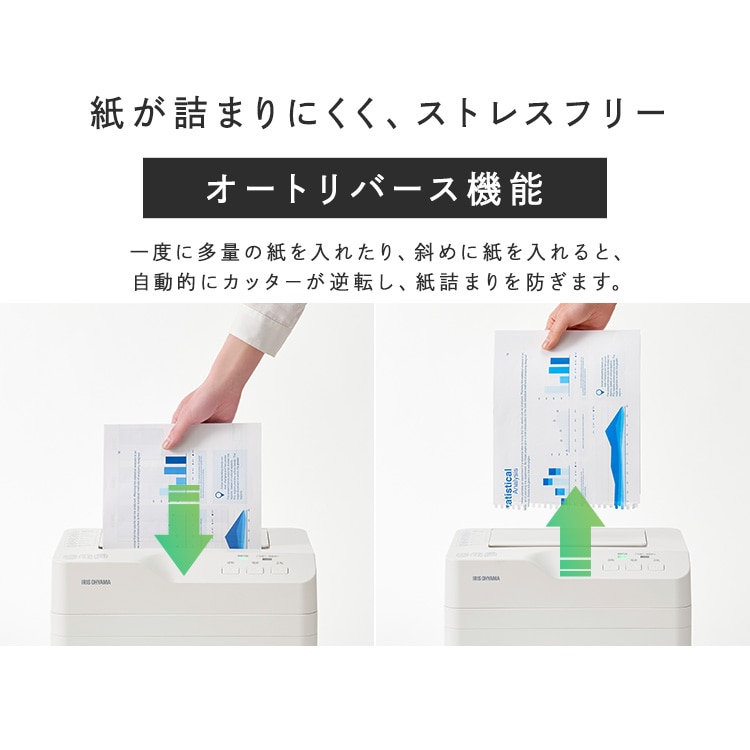 【商品説明】置くだけ、待ち時間ゼロ(※1)で“最大60枚”大量細断。オートフィード(自動給紙)タイプだから、紙をセットするだけで細断してくれます。手差しでの使用も可能、カバーを閉めた状態でも細断できます(※2)。※1:手差しで連続細断(1枚ずつ)した場合と、本機で自動細断したもので比較。※2:手差しの場合:同時細断枚数9枚以内/連続使用時間10分。【紙が詰まりにくい&ストレスフリーを叶える機能】・オートクリーニング機能:自動で清掃運転(逆転5秒/正転5秒)を行い、カッターの汚れを落とします。・オートリバース機能:一度に多量の紙を入れたり、斜めに紙を入れると、自動的にカッターが逆転して紙詰まりを防ぎます。【クロスカットで個人情報を守る】約4×15mmのクロスカットタイプ“DIN規格:P-4(※)”。重要な情報のセキュリティ保護におすすめです。※DIN規格は、ドイツ規格協会(Deutsches Institut fur Normung)で制定された、世界中で国際基準として認められている工業規格です。【驚きの収容力】たっぷり収容できる“容量18.5L”引き出し式ダストボックスと紙片が細かいクロスカットで、細断くずを効率良く収容可能。ゴミ捨ての回数、ゴミ袋の消費を抑えます。【キャスターで移動ラクラク】キャスター付きだから移動もスムーズで、前2輪はロック可能だから固定も可能。デスク横でも邪魔になりにくいコンパクトさで、オフィスでもご家庭でもご使用いただけます。【誰でも簡単操作】電源ボタンを押し、細断可能ランプ(緑)が点灯したら細断スタート。ダストボックスに細断くずがたまったら、ゴミ捨てランプ(赤)でお知らせし、細断が止まります。【お手入れ簡単】ユニット部分を開けて掃除可能。紙送りローラーと紙送りセンサーのお手入れ、詰まった紙の除去が簡単にできます。【安心安全へのこだわり】・サーマルプロテクター:モーターが熱くなりすぎると自動停止します。・ダストボックススイッチ:細断くずを捨てる時やダストボックスが本体に正しくセットされていない場合は、本体電源を遮断して作動しないようにします。【商品仕様】●細断サイズ(約)4×15mm(クロスカット)●細断速度約2.4m/分●細断枚数(※)定格:6枚最大:9枚●最大給紙枚数(自動細断)60枚(※)●商品サイズ(cm)幅約35×奥行約22×高さ約49.2(スイッチ、電源コード含まず)●質量約8.1kg●電源コード長さ約1.4m●ダストボックス容量18.5L●電源電圧AC100V、50/60Hz●定格消費電力100W(50/60Hz)●待機電力1.1W●投入幅220mm(紙投入口)●定格時間10分※A4コピー用紙(上質紙64g/m2)