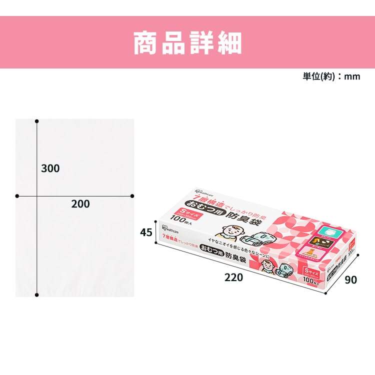 ●内容量100枚入り●商品サイズ(cm)1枚あたり:幅約20×長さ約30(Sサイズ)パッケージ:幅約22×奥行約9×高さ約3●厚さ約0.02mm●商品質量1枚あたり:約2.2gパッケージ:約270g●原料樹脂ポリエチレン、他●耐冷温度-30℃●色白色●使用用途おむつ、生ごみ、ペットのふん等※食品を入れないでください。