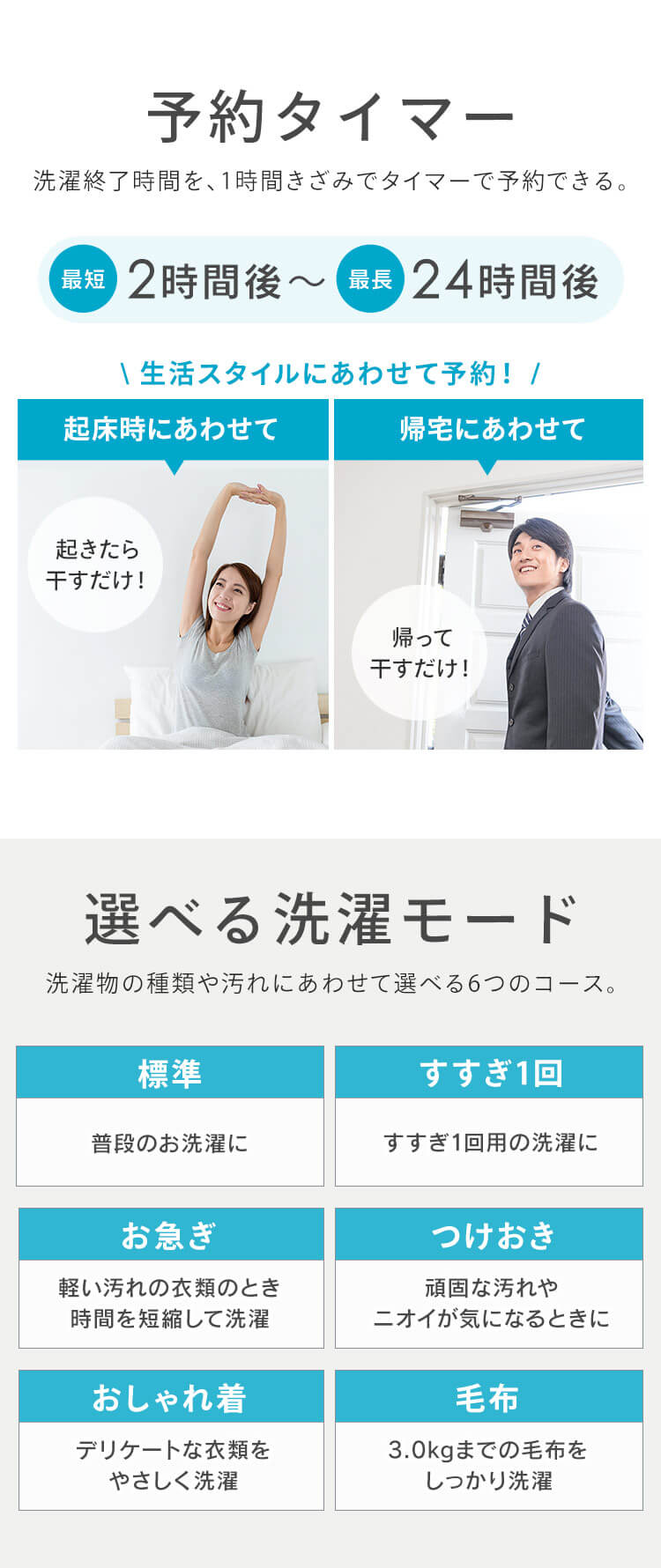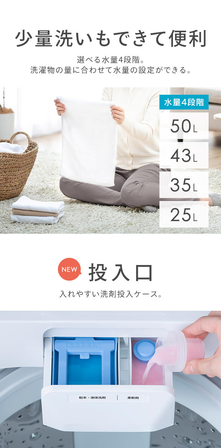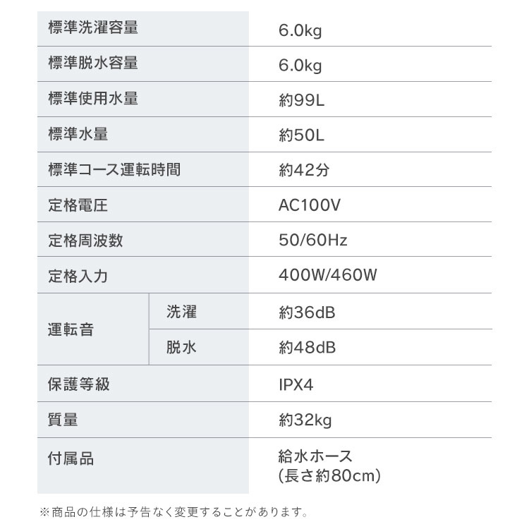 【商品説明】毎日使うものだから、より使いやすさにこだわった[全自動洗濯機:6kg]。【洗浄力UP】大流量×立体水流で衣類をしっかり撹拌!従来品(※1)よりも広い槽内で衣類がよく動くから、ガンコな汚れもしっかり落とす。【節水】1回の洗濯に使用する水量が従来品(※1)と比べて約33L減!約132Lから“約99L”に。【LOW設計“手前の高さ:約83cm”】容量はそのまま、高さをコンパクトに。ラクな姿勢で洗濯物を取り出しやすい高さ。【さらにうれしいポイント】・時短:従来品(※2)よりも洗濯時間13分短縮!洗濯時間をぐっと短く、忙しい朝の準備もスムーズに。・部屋干しモード:脱水後にさらに洗濯槽と脱水槽を回転させてしっかり水分を飛ばし、部屋干し時間を短縮!生乾きのニオイも抑える。・予約タイマー:洗濯終了時間を1時間きざみ(最短2時間後~最長24時間)で予約できるから、生活スタイルにあわせられる。【選べる洗濯モード:洗濯物の種類や汚れに合わせて選べる“6つのコース”】・標準:普段のお洗濯に。・お急ぎ:軽い汚れのときに時間を短縮して洗濯。・おしゃれ着:デリケートな衣類をやさしく洗濯。・すすぎ1回:すすぎ1回用の洗剤に。・つけおき:頑固な汚れやニオイが気になるときに。・毛布:約3kgまでの毛布対応で、大物もしっかり洗濯。【少量洗いもできて便利】選べる水量4段階“50L/43L/35L/25L(手動)”。洗濯物の量に合わせて水位の設定ができます。【投入口】わかりやすく入れやすい、洗剤投入ケース。【いつもキレイな洗濯槽】丈夫で汚れに強いステンレス槽。さらにキレイを保つ2つのコース[槽洗浄コース:見えない汚れをお手入れ/槽乾燥コース:洗濯後に行うとカビ予防に]。【折りたたみ式のふた】折りたたみ式のふたで、ランドリーラックを設置しても開けやすい。【チャイルドロック】「すすぎ」と「脱水」の2つのボタンを同時押しで設定可能。チャイルドロック使用時はふたが開かないので安心!※1:アイリスオーヤマ調べ。IAW-T604Eと比較。※2:アイリスオーヤマ調べ。IAW-T604Eと比較。標準コースでの比較。【商品仕様】●種類全自動電気洗濯機●定格電圧AC100V●定格周波数50/60Hz●定格消費電力(50/60Hz)400/460W●標準洗濯容量6kg●標準脱水容量6kg●標準使用水量99L●標準水量50L●防水レベルIPX4●商品サイズ(cm)本体外寸最大:幅約56.7×奥行約54.9×高さ約89.3(給排水ホース含む)手前高さ:約83●質量約32kg●付属品給水ホース(約0.8m)、保護カバー、ねじ×4本