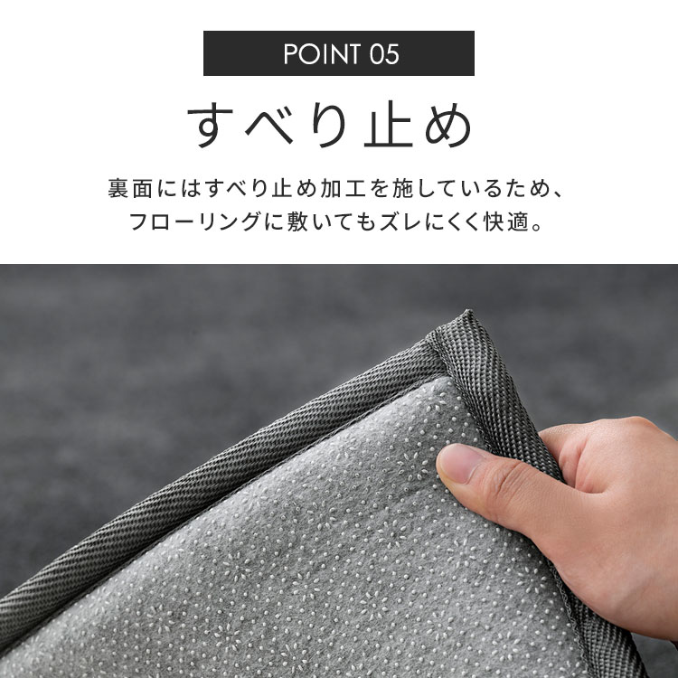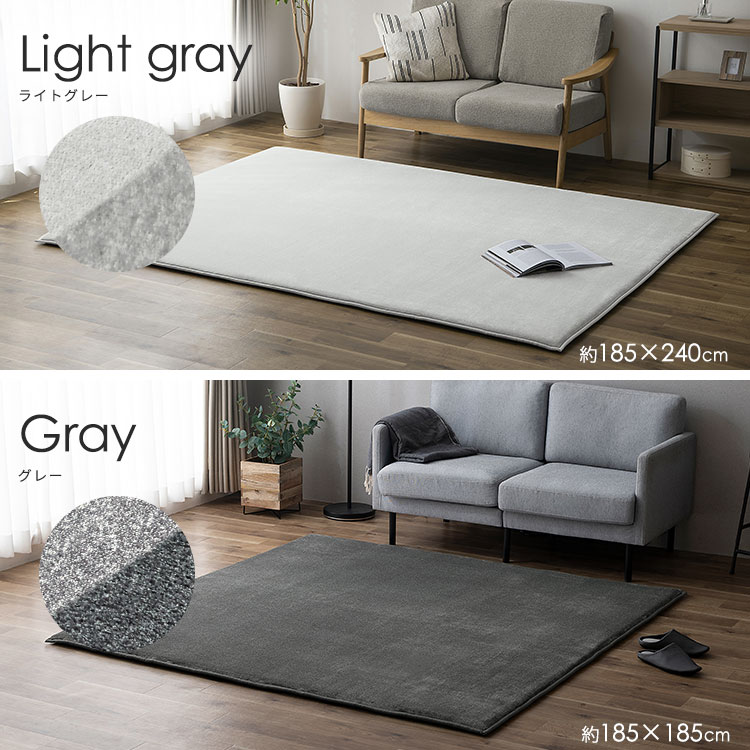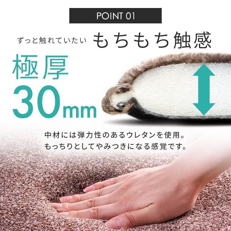 【商品説明】もちっと新触感のラグ。ホットカーペット対応です。◆ずっと触れていたいもちもち触感厚さ3cmの極厚ウレタンは弾力性抜群!もっちりとしてやみつきになる感覚です。これ1枚で床付き感なし!座っても、寝転んでも、極厚のラグがやさしく包み込んでくれます。◆なめらかな肌触りさらさらの肌触りが心地良い、密度の高いマイクロファイバー。短い毛足はさらっとしていてまとわりつかないので、一年を通じて気持ちよくお使いいただけます。◆うれしい、微はっ水加工うっかり飲み物をこぼしてもサッと拭き取るだけ。液体がしみこみにくいから、お手入れが簡単。※汚れたときはすぐに拭き取ってください。◆優れた防音性遮音等級ΔLL(I)-9*を取得。マンションなど階下への生活音が心配な方におすすめ。小さなお子様やペットがいるご家庭も、安心してお過ごしいただけます。*第三者機関にて検査実施◆すべり止め加工裏面にはすべり止め加工を施しているため、フローリングに敷いてもズレにくく快適。【商品仕様】●商品サイズ(cm)幅約185×奥行約240●重量約5.0kg●厚さ約3cm●組成表地:ポリエステル100%裏地:ポリエステル100%、パイピング(ポリプロピレン100%)、すべり止め加工(塩化ビニル樹脂)●中材ウレタンフォーム