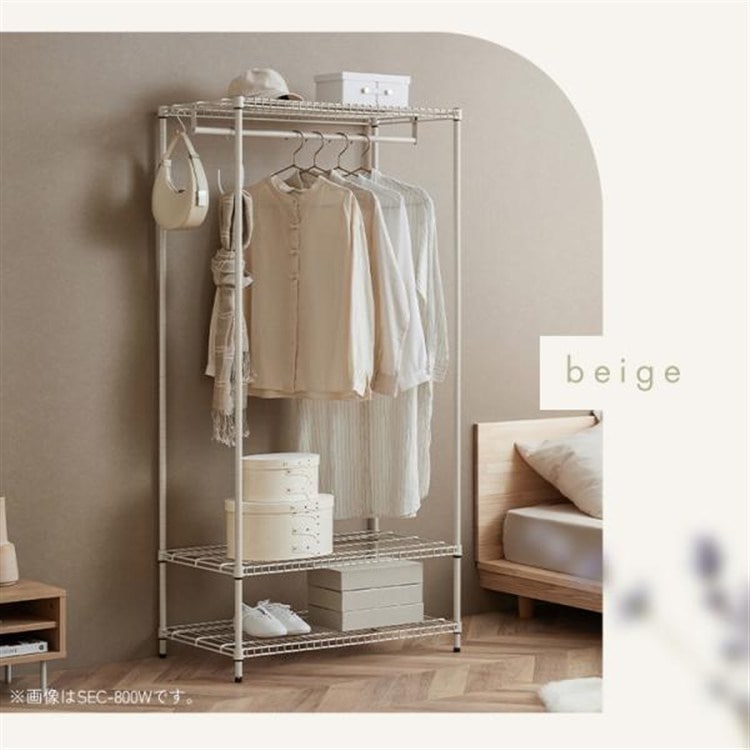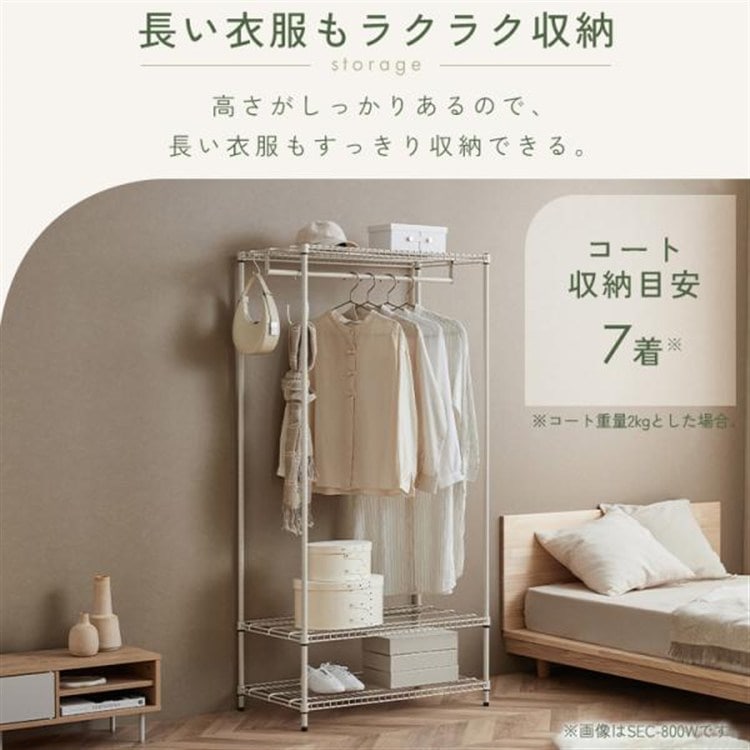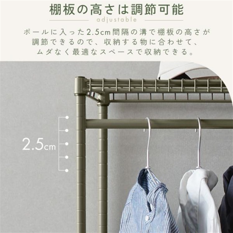 【商品説明】奥行スリムで使いやすい。お部屋に馴染むナチュラルデザインのカラースチールシェルフ。[ワードローブタイプ:小/W59×D45×H161.8cm]。【長い衣服もラクラク収納】コート収納目安:約7着。(※コート1着あたりの重量を約2kgとした場合。)高さがしっかりあるので、長い衣服もすっきり収納できる。【棚板の高さは調節可能】ポールに入った2.5cm間隔の溝で棚板の高さを調節可能。収納するものに合わせてムダなく最適なスペースを作れる。【豊富なシリーズ】カラースチールシェルフシリーズで揃えれば、お部屋に統一感も出しやすい。組み合わせてより使いやすく、自分に合うインテリアに。【キズ・サビに強い粉体塗装】防サビ性◎/耐熱性◎/耐油性◎!水回りやキッチンにも置ける。(※水分・油分・洗剤などが付着した場合は、素早く拭き取ってください。長時間放置すると、腐食やサビの原因となる恐れがあります。)【カンタン組み立て】1.ポールに棚板固定部品を取り付ける。2.ポールに棚板を差し込む。3.1番下の棚板をはめたらラックを立て、好みの位置に調節。4.全体が組みあがったら、軽く叩いて棚板を固定する。(※ゴムハンマーを使うことをおすすめします。)★お客様組立★【商品仕様】●製品寸法(cm)幅約59×奥行約45×高さ約161.8(アジャスター含む)●製品質量約8.2kg●棚板枚数3枚●耐荷重全体:約60kg棚板(1枚あたり):約15kgハンガーパイプ:約15kg※耐荷重は測定値であり、保証値ではありません。●主要材質ポール、棚板:金属(鋼/エポキシ粉体塗装)棚板固定部品:ABS樹脂アジャスター:PP●必要工具+ドライバー(サイズ:2番)、ソフトハンマー(プラスチック、木、ゴム製など)、ゴム手袋※2人以上での組み立てをおすすめします。