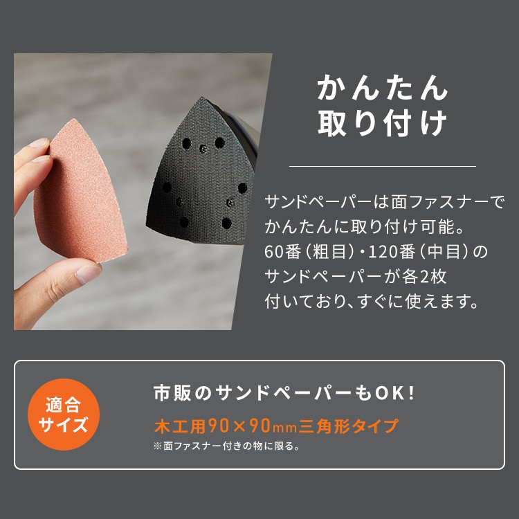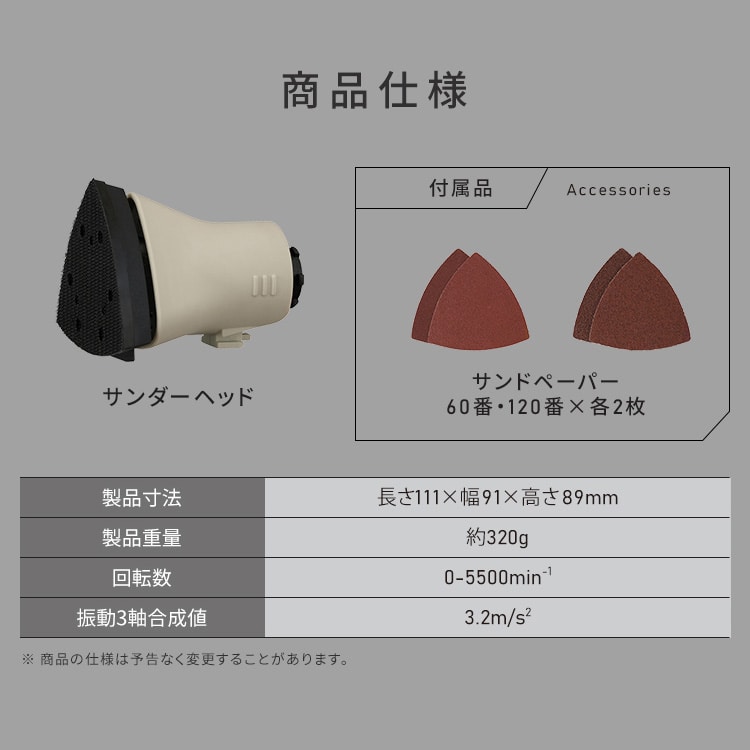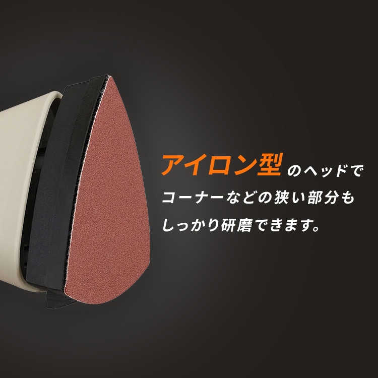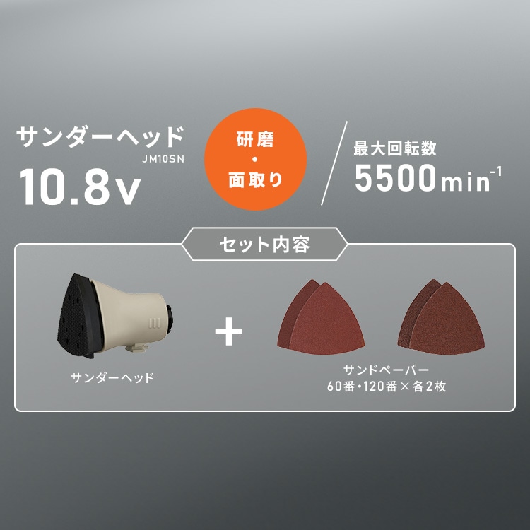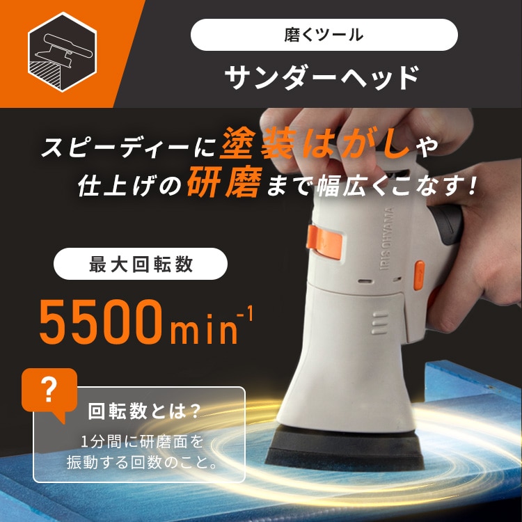 【商品説明】スピーディーに研磨が可能!サンダーヘッド10.8V※ご使用には別売りのマルチギア本体とバッテリーが必要です。【マルチギアシリーズ】ヘッドを自由に付け替えできて、マルチに活躍できるシリーズ。本体とバッテリーは共通でいろんな工具に変身できるから、コスパもスぺパも◎。これからDIYをはじめる方からもっと楽しみたい方まで、幅広い層におすすめのシリーズです。<パワフル研磨>最大振動数5500rpmで塗装剥がしや仕上げの研磨まで幅広く。アイロン型のヘッドでコーナーなどの狭い部分もしっかり研磨できます。<かんたん取り付け>サンドペーパーは面ファスナーでかんたんに取り付け可能。市販のサンドペーパーも使用OK!【商品仕様】【サンダーヘッド】●製品寸法(cm)長さ約11.1×幅約9.1×高さ約8.9●製品質量約320g●回転数0-5500min-1●振動3軸合成値3.2m/s2●付属品サンドペーパー 2種(60番、120番)×各2枚※商品の仕様は予告なく変更することがあります。【アイリスオーヤマ 10.8Vマルチギア】本体とのセット・マルチギア 充電式ドリルドライバーセット10.8V PJM10DRS ・マルチギア 充電式インパクトドライバーセット 10.8V PJM10INS ヘッド単品・マルチギア インパクトドライバーヘッド 10.8V JM10IN・マルチギア サンダーヘッド 10.8V JM10SN・マルチギア ジグソーヘッド 10.8V JM10JGバッテリー単品・充電式リチウムイオンバッテリー 10.8V DBL1020C