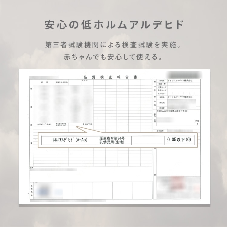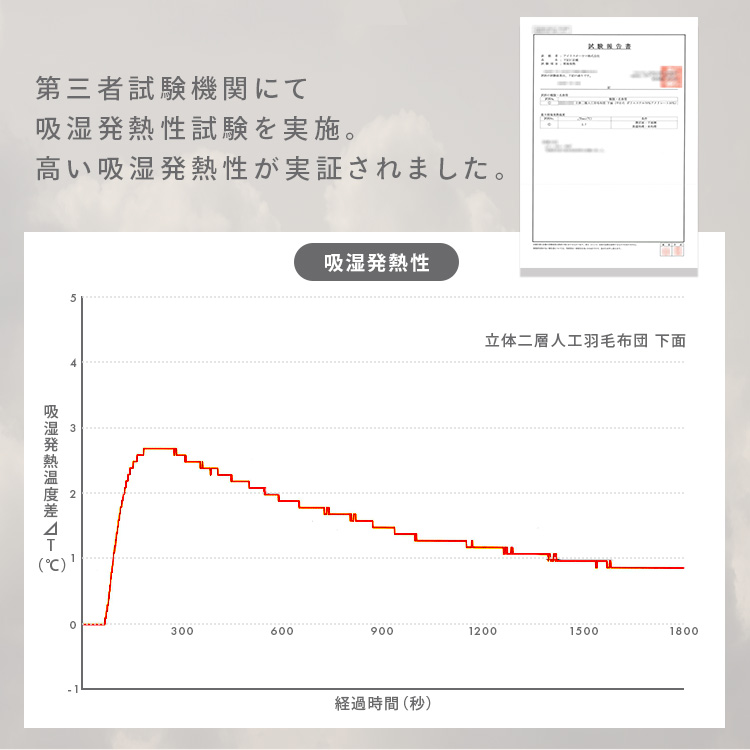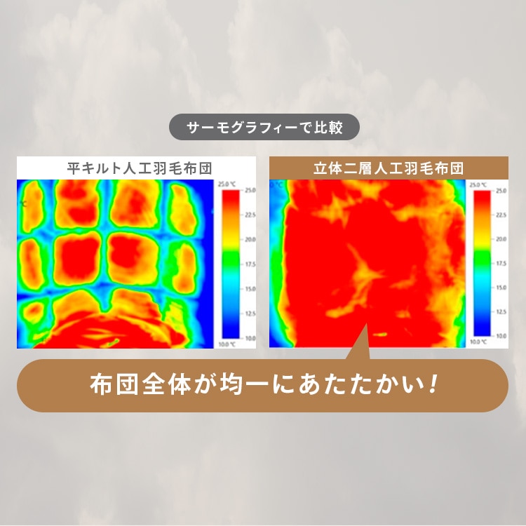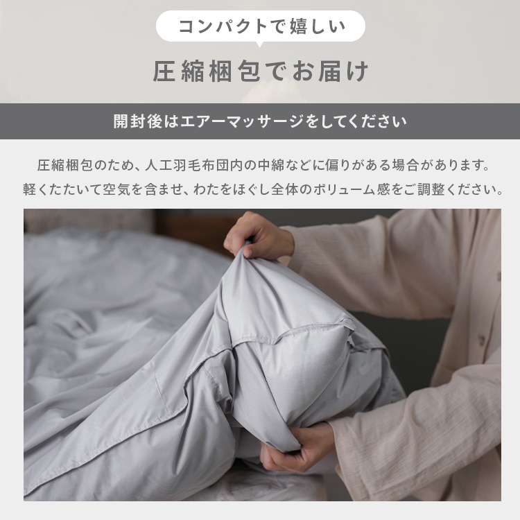 【商品説明】丸洗いできる、あったか羽毛タッチ布団。「洗えない」「羽毛のニオイが気になる」などのお悩みを解決。羽毛じゃないけど羽毛のようにあたたかく軽い。【二層構造】上層[保温]:蒸気の伝わりにくい上層には、ポリエステル100%の人工羽毛(粒わた)を使用、しっかり保湿。下層[発熱]:アクリレート(※)30%含む人工羽毛(粒わた)使用で、高い吸湿発熱効果を発揮。【立体二層キルト】布団のふっくら感をキープ。上下層のキルト位置をずらし、コールドスポットを解消。【側生地】吸湿性のある綿混素材。人体の発する蒸気を内部に伝え、吸湿発熱を促進。【丸洗いできて清潔を保てる】手洗い洗濯できるから、洗えばいつでも心地よく使える。【イヤなニオイを抑える消臭加工付き】詰物(下層)は、主な汗臭の原因成分(アンモニア・酢酸)を抑える消臭加工付き。(※第三者試験機関にて、消臭性試験をクリア。汗臭原因成分約98%減少。)【商品仕様】●商品サイズ(cm)幅約190×奥行約210(ダブルサイズ)●商品質量約3.4kg(充填量:約2.0kg)●材質[側生地]ポリエステル85%、綿15%[詰め物]上層:ポリエステル100%下層:ポリエステル70%、合成繊維(アクリレート※)30%※帝人フロンティア(株)の吸湿発熱素材「サンバーナー(R)」を使用。●洗濯表示・液温は40℃を限度とし、手洗いができる・塩素系及び酸素系漂白剤の使用禁止・タンブル乾燥禁止・日陰のつり干しがよい・アイロン仕上げ禁止・ドライクリーニング禁止・ウェットクリーニングができる