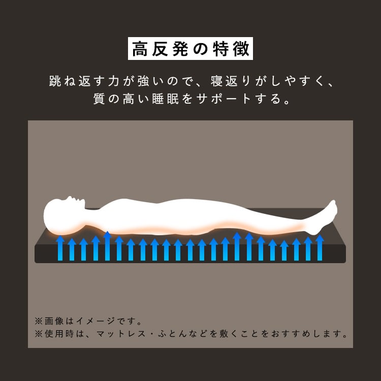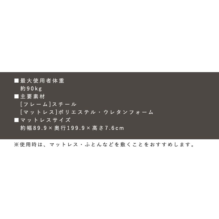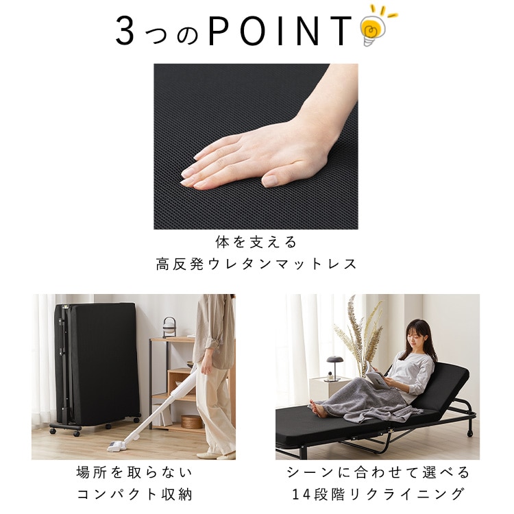【商品説明】高反発×シングルサイズ”の折りたたみベッド。 折りたためるベッドで限られた生活空間を活用し、寝心地にもこだわりを。 【体を支える“高反発”ウレタンマットレス】 厚さ約8cm、跳ね返す力が強く寝返りがしやすい高反発ウレタンマットレス。 体が沈み込み過ぎるのを防ぐため、かたさの異なるウレタンを2種使用。 [高反発がおすすめな人:安定感がほしい/寝返りが多い/かための寝心地が好き] 【場所を取らないコンパクト収納】 少しの力でラクに折りたためる。 折りたたむと「約1/6(最大:約210cm→最小:約34.5cm)」に。 キャスター付きなので移動もしやすく、ホコリがたまりやすいベッド下もこまめに掃除ができる。 【14段階リクライニング】 背もたれの角度は14段階設定可能。 読書やテレビを見るときなど、シーンに合わせて使える。 【安心設計】 ・指はさみ防止設計:折りたたむ時、ベッドフレームの間に隙間ができるから、指をはさむのを防ぐ。 ・ストッパーピン:ベッドが浮き上がるのを防ぎ、折りたたみ時には勝手に広がるのを防ぐ。 ・最大使用者体重約90kg:丈夫なつくりで安心して使える。 ★お客様組立★ ●サイズ シングルサイズ ●製品サイズ(cm) 使用時:幅約96×奥行約210×高さ約31.5 折りたたみ時:幅約96×奥行約34.5×高さ約108.5 マット:幅約89.9×奥行約199.9×厚み約7.6 ●製品質量 約23kg ●主要材質 パイプ:金属(鋼/エポキシ樹脂塗装) マット:ウレタンフォーム、合板 側地:ポリエステル ●最大使用者体重 約90kg ●リクライニング 14段階 ※マットレス、ふとんなどを敷いてご使用することをおすすめします。