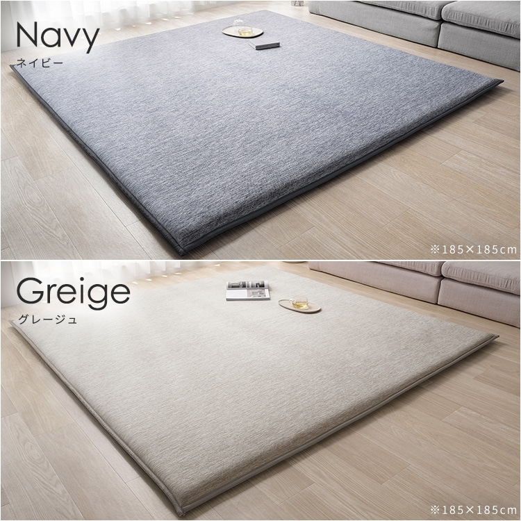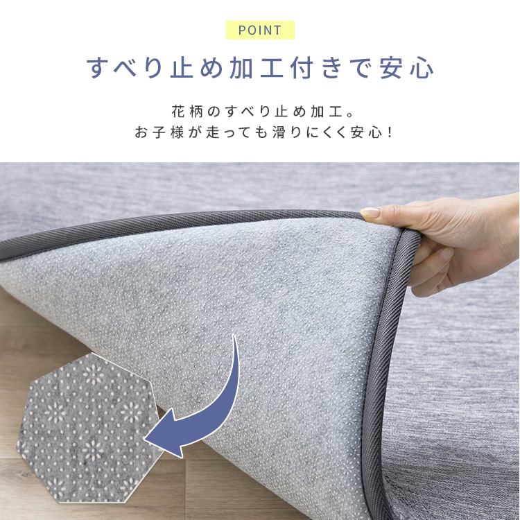【商品説明】ひんやり快適、ずっとこのまま。もちひや“超極厚ウレタン:約45mm”。[防音/接触冷感/ホットカーペット対応/すべり止め]【Q-MAX:0.458W/cm2】触れた瞬間ヒヤッ!さらなる涼しさを求めるあなたへ。[Q-MAXとは:生地に触れた瞬間の熱移動量を数値化したもので、ひんやり感の指標となる数値。この数値が高いほど冷たいとされており、0.2W/cm2以上が冷たく感じる目安。]【底つき感ゼロ:超極厚ウレタン】内部に極厚の高反発ウレタンを使用。じんわりと沈み込み、ふんわりと跳ね返す弾力性はやみつきになる触感。【優れた防音性】集合住宅でも足音が聞こえないレベルの遮音等級「ΔLL(I)-9」※を取得。生活音を吸収して快適に過ごすことができる。※第三者機関にて検査実施。【安心の低ホルムアルデヒド】ホルムアルデヒド試験で0.05以下(1)合格。小さなお子様や肌が敏感な方でも安心して使用できる。※ホルムアルデヒド0.05以下(1)は0.01以下。第三者機関にて検査実施。【お掃除を楽に】繊維に毛足がないのでゴミが絡まりにくく、掃除機をかけるのも楽ちん。【すべり止め加工付き】フローリングに敷いても、ラグがズレにくい。【商品仕様】●製品サイズ(cm)幅約185×奥行約240●ウレタンフォーム厚さ約4.5cm●製品質量約6.6kg●組成表地:ポリエチレン70%、ナイロン30%裏地:ポリエステル100%(すベり止め加工:塩化ビニル樹脂)縁材:ポリプロピレン100%中材:ウレタンフォーム※本製品は洗濯できません。汚れた時は、すぐに拭き取ってください。※お買い上げ後は、すぐに圧縮梱包から取り出してください。圧縮梱包の状態で長時間放置すると回復に時間がかかる場合があります。また湿度の高い所に放置すると、回復しなくなることがあります。