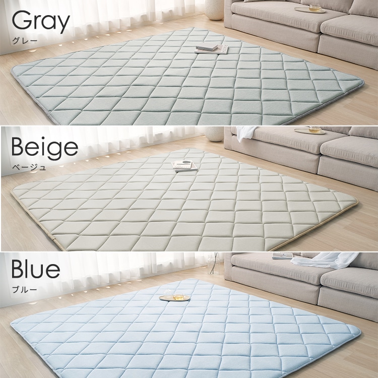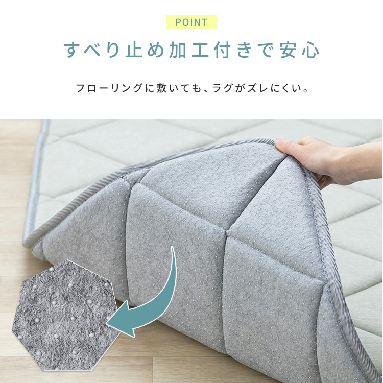 【商品説明】ひんやり心地よさ、長く続く。もちひや“極厚ウレタン:約30mm”。[防音/接触冷感/持続冷感/すべり止め]【冷感ジェルでひんやりが長く続く】中材に冷感ジェル付きのウレタンを使用し、ひんやり感の持続性UP。【Q-MAX:0.402W/cm2】定番よりもっとひんやり、暑がりさんの夏には欠かせない![Q-MAXとは:生地に触れた瞬間の熱移動量を数値化したもので、ひんやり感の指標となる数値。この数値が高いほど冷たいとされており、0.2W/cm2以上が冷たく感じる目安。]【ふっくらとした踏み心地】弾力性のあるウレタン使用で、ふっくらやみつきになる感覚。【生活音を抑える】極厚ウレタンが生活音を吸収するので、マンションや階下への生活音が心配な方にオススメ。【安心の低ホルムアルデヒド】ホルムアルデヒド試験で0.05以下(1)合格。小さなお子様や肌が敏感な方でも安心して使用できる。※ホルムアルデヒド0.05以下(1)は0.01以下。第三者機関にて検査実施。【お掃除を楽に】繊維に毛足がないのでゴミが絡まりにくく、掃除機をかけるのも楽ちん。【すべり止め加工付き】フローリングに敷いても、ラグがズレにくい。【商品仕様】●製品サイズ(cm)幅約185×奥行約185●ウレタンフォーム厚さ約3cm●製品質量約4kg●組成表地:ポリエチレン50%、ナイロン25%、ポリエステル25%裏地:ポリエステル100%(すベり止め加工:塩化ビニル樹脂)縁材:ポリプロピレン100%中材:ウレタンフォーム※本製品は洗濯できません。汚れた時は、すぐに拭き取ってください。※お買い上げ後は、すぐに圧縮梱包から取り出してください。圧縮梱包の状態で長時間放置すると回復に時間がかかる場合があります。また湿度の高い所に放置すると、回復しなくなることがあります。