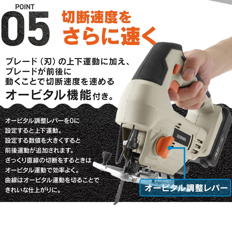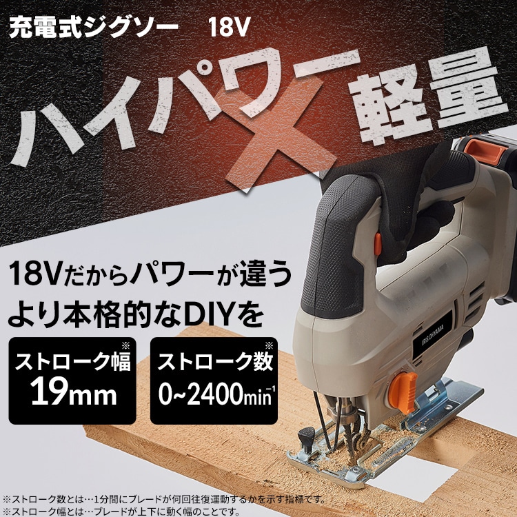 【商品説明】ハイパワー×軽量、充電式ジグソー[18V]。【直線・曲線どちらも対応】直線の切断はもちろん、曲線の切断も簡単に。難しい窓抜き(ほぞ穴)加工もキレイに仕上がる。角度を変えて傾斜切断もできる。【USB Type-C(TM)充電バッテリー】専用充電器不要、USB Type-C(TM)ケーブルからバッテリーに直接充電!(※USB充電器は付属していません。)残量が一目でわかる、充電池残量確認機能付き。充電式(コードレス)なので、どこにでも運んで使える。アイリスオーヤマの電動工具、園芸機械シリーズなら「18Vバッテリー」を使いまわせる。【片手で持てる軽量な18V】サイズ(約):26(ブレード部分除く)×21.3×8.1cm/約1.9kg。(※バッテリーを含みます。)【握る強さでスピード変速】運転スイッチを握る強さで0~2400min-1のストローク数に変速。曲線などの細部切断でスピードをコントロールしやすい。【切断速度をさらに速く】ブレード(刃)の上下運動に加え、ブレードが前後に動くことで切断速度を上げるオービタル機能付き。・オービタル機能なし:上下のみ動き、きれいな切断面に。曲線や細部の切断、軟鋼板の切断におすすめ。・オービタル機能あり:上下の動きに加えて前後にも動き、切断速度は早くなるが粗めの切断面に。大まかな直線の切断におすすめ。【傾斜角度の調整】ガイドプレートを動かすことで、最大左右45度(3段階:15度刻み)まで傾斜切断できる。【取り外しできるブレード】工具を使わず簡単に、ブレード(刃)の取り付け/外しができる。市販の金属用ブレード(※)を取り付けて、金属を切断することも。※以下の条件を満たすブレードが使えます。・厚さ:1~1.3mm以内・幅:6.2mm※本製品の最大切断能力を超える材料の切断はできません。※市販のブレードを使用すると本製品の最大切断能力以下になる場合があります。【タブルロックで誤作動防止】安全スイッチと運転スイッチを同時に押すことで起動する「ダブルロック仕様」で不意の誤作動を防止。【商品仕様】【製品仕様】●製品寸法(cm)長さ約26×幅約8.1×高さ約21.3※ブレード部含まず。バッテリーを含む。●製品重量約1.9kg※バッテリーを含む。●ストローク(長/数)19mm/0~2400min-1●最大切断能力の目安(板厚)約45mm(木材)※数値は付属のブレードを使用したときのものであり、目安です。加工物の種類や刃物の切れ味などの作業条件により異なります。●傾斜切断左右45度●連続運転時間(無負荷)約34分●付属品充電式リチウムイオンバッテリー(型番:DBL1820C)、USB充電ケーブル(Type-C to C)、木工用ブレード【バッテリー仕様】●型番DBL1820C●製品寸法(cm)幅約7.5×奥行約12.8×高さ約5.3●製品重量約400g●電池種類リチウムイオン二次電池●電池電圧18V●電池容量2000mAh●充電方式USB Type-C(TM)●充電時間約120分(USB)※出力20W以上のUSB充電器を使用した場合。室温、使用時間、USB充電器の出力によって充電時間が長くなることがあります。●USB入・出力電圧/電流DC 5V/3A、DC 9V/2.22A、DC 12V/1.66A●定格電圧DC 5V●定格容量6000mAh●使用温度0~40℃(充電時:5~35℃)※USB充電器は付属していません。出力20W以上のUSB Type-C(TM)端子搭載の充電器(PSE適合品)をご用意ください。※USB Type-C(TM)は、USB Implementers Forumの商標です。【別売品】充電式リチウムイオンバッテリー(型番:DBL1820C)
