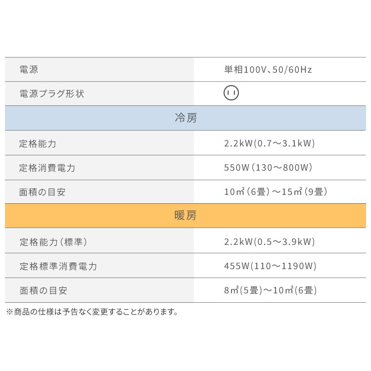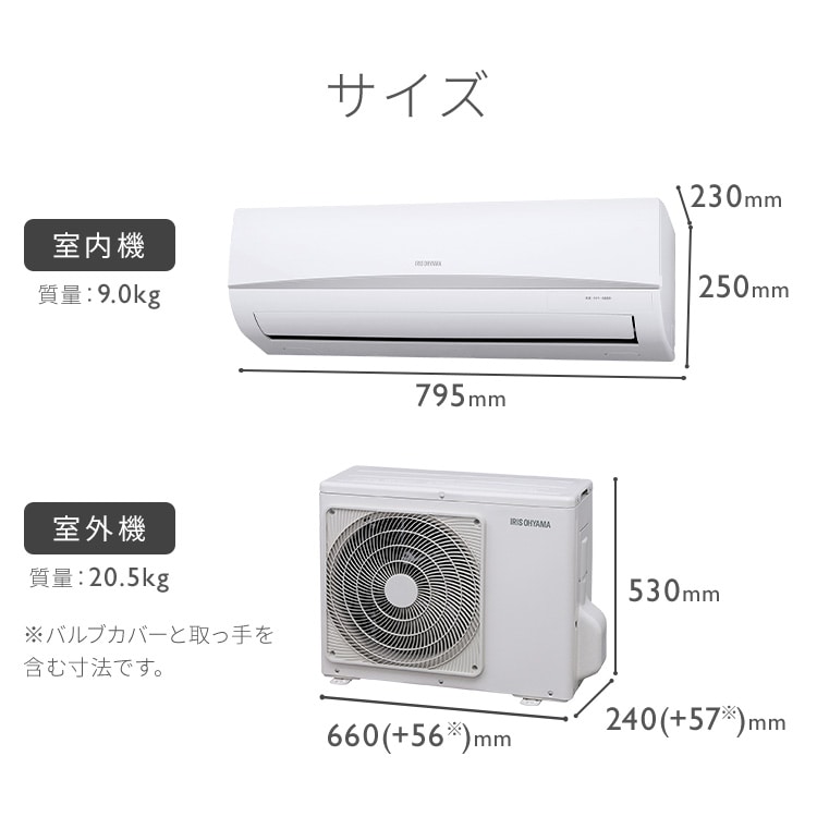 【商品説明】シンプルで使いやすいスタンダードモデルのエアコンです。リビングはもちろん、寝室やこども部屋など、どんな部屋にもおすすめです。「いたわりエコモード」で、冷やしすぎ・暖めすぎないよう運転を制御して消費電力を抑えられます。リモコンとエアコンの2か所に搭載されているセンサーで室温を管理・把握するので、リモコンを手元に置くことでより体感に近く過ごしやすい室温を保ちます。エアコンの入/切を1時間単位で24時間まで、タイマー予約できます。上下左右ルーパーで、効率よくお部屋の空気を循環させます。冷房または除湿を10分以上運転後、停止時に自動で室内機の内部清浄を行います。内部清浄機能は自動操作しない設定も可能です。【ご購入にあたっての注意事項】※代引き・配達日時指定不可。※沖縄・離島につきましては別途送料が発生致しますので、ご了承ください。※商品の型番に間違いがないか必ず確認の上ご注文ください。※ご注文後の「キャンセル・ご返品・ご返金」は発送前でもお受けできません。※工事をご希望の際は「標準取付工事込み」の商品をご注文ください。【お届けした商品の初期不良について】※商品受け取り時に箱や商品に凹み・キズ・破損が見受けられた場合、お届けに伺ったドライバーにご指摘のうえ受け取り拒否をお願いします。※ドライバーが帰ったあとで商品受け取り時に箱や商品に凹み・キズ・破損が見受けられた場合、すぐに配送会社にその旨をご連絡ください。※取り付け工事時、商品に凹み・キズ・破損が見受けられた場合は、工事を中止していただくようお願いいたします。【商品仕様】【6畳タイプ:IRA-2206R】●電源単相100V、50/60Hz●電源プラグ形状並行型●冷房定格能力:2.2kW(0.7~3.1kW)定格運転電流:6.47A定格消費電力:550W(130~800W)運転音(室内/室外機):57dB面積の目安(鉄筋アパート南向き洋室/木造南向き和室):15m2(9畳)/10m2(6畳)●暖房定格能力:2.2kW(0.5~3.9kW)定格運転電流:5.35A定格消費電力:455W(110~1190W)運転音(室内/室外機):59/57dB面積の目安(鉄筋アパート南向き洋室/木造南向き和室):10m2(6畳)/8m2(5畳)外気温2℃時:暖房能力2.8kW/消費電力1050W●通年エネルギー消費効率(JIS C 9612:2013)5.8●区分名A●外形寸法(cm)室内機:幅約79.5×奥行約23×高さ約25室外機:幅約66×奥行約24×高さ約53●質量室内機:約9kg室外機:約20.5kg【10畳タイプ:IRA-2806R】●電源単相100V、50/60Hz●電源プラグ形状並行型●冷房定格能力:2.8kW(0.7~3.4kW)定格運転電流:7.57A定格消費電力:720W(120~970W)運転音(室内/室外機):59dB面積の目安(鉄筋アパート南向き洋室/木造南向き和室):19m2(12畳)/13m2(8畳)●暖房定格能力:3.6kW(0.5~4.8kW)定格運転電流:8.92A定格消費電力:865W(110~1400W)運転音(室内/室外機):60/61dB面積の目安(鉄筋アパート南向き洋室/木造南向き和室):16m2(10畳)/13m2(8畳)外気温2℃時:暖房能力3.5kW/消費電力1240W●通年エネルギー消費効率(JIS C 9612:2013)5.7●区分名A●外形寸法(cm)室内機:幅約79.5×奥行約23×高さ約25室外機:幅約78×奥行約29×高さ約55●質量室内機:約9.5kg室外機:約29kg【14畳タイプ:IHF-4009G】●電源単相100V、50/60Hz●電源プラグ形状アイエル(IL)型●冷房定格能力:4.0kW(0.7~4.3kW)定格運転電流:13.13A定格消費電力:1260W(130~1370W)運転音(室内/室外機):62/65dB面積の目安(鉄筋アパート南向き洋室/木造南向き和室):28m2(17畳)/18m2(11畳)●暖房定格能力:5.0kW(0.7~6.2kW)定格運転電流:14.79A定格消費電力:1420W(150~1850W)運転音(室内/室外機):61/67dB面積の目安(鉄筋アパート南向き洋室/木造南向き和室):23m2(14畳)/18m2(11畳)外気温2℃時:暖房能力4.5kW/消費電力1640W●通年エネルギー消費効率(JIS C 9612:2013)4.9●区分名A●外形寸法(cm)室内機:幅約79.5×奥行約23×高さ約25室外機:幅約78×奥行約29×高さ約55●質量室内機:約10kg室外機:約34.5kg