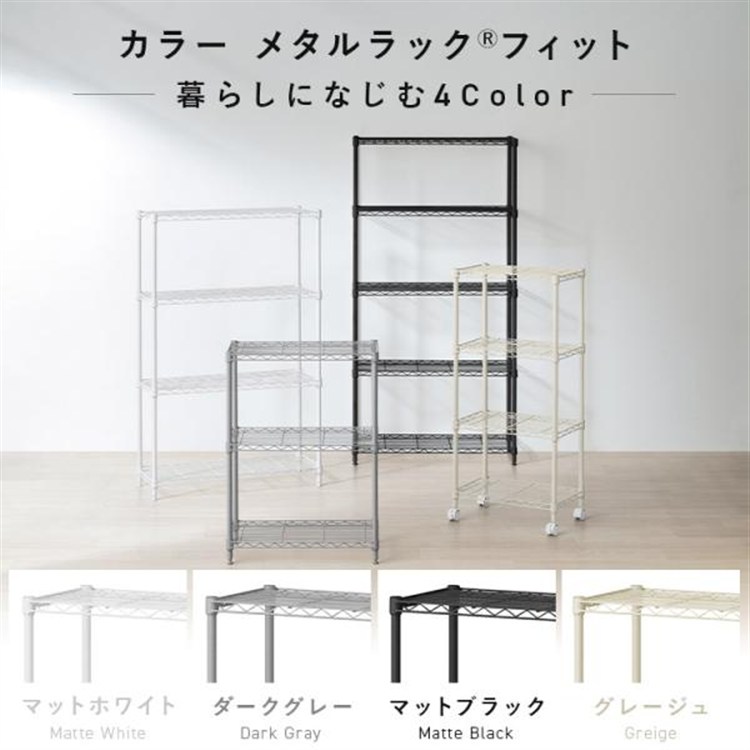 【商品説明】暮らしに彩り、フィットする収納。奥行30cm、スリムでどんなお部屋にもぴったりフィット。スペースを無駄なく活用。◆カラーメタルラックフィットシリーズ暮らしになじむ4カラー。6タイプから組み合わせて自在にカスタマイズ。置きたい場所やものに合わせて選べる。◆高級感のあるつや消し加工高級感のあるマットな質感で、お部屋をおしゃれに演出。指紋や汚れが目立ちにくい。◆奥行スリムでスマートな収納奥行30cmで収納ボックスがぴったりフィット。限られた空間も広々使える、省スペース設計。収納ボックスと組み合わせて使うことで無駄なく統一感のある収納スペースに。◆高さ自由、収納自在棚板は約2.5㎝間隔で微調整可能。スペースを最大限に活用できる。置き場所や用途に合わせて自分好みにカスタマイズ。棚板を外せば、ランドリーラックやゴミ箱上ラックにも。◆アジャスター付きの脚高さの微調整ができ、ガタつきを抑えるアジャスター付きです。◆棚板一枚あたり耐荷重30kg◆ドライバー不要の簡単組み立てゴムハンマーの使用をお勧めします。★お客様組立★【商品仕様】●商品サイズ(cm)外寸(アジャスター含):幅約55×奥行約30×高さ約78棚板内寸サイズ:幅約49.3×奥行約24.3●質量約3.95kg●棚板3枚●ポール直径約19mm●耐荷重全体:約90kg棚板(1枚あたり):約30kg●主要材質金属部:金属(鋼)(エポキシ樹脂塗装)棚板固定パーツ・アジャスター:ABSエンドキャップ:ポリエチレン●カラーマットホワイト、マットブラック、グレージュ、ダークグレー