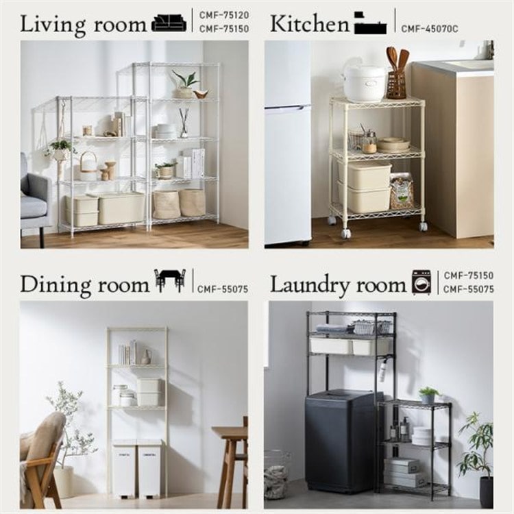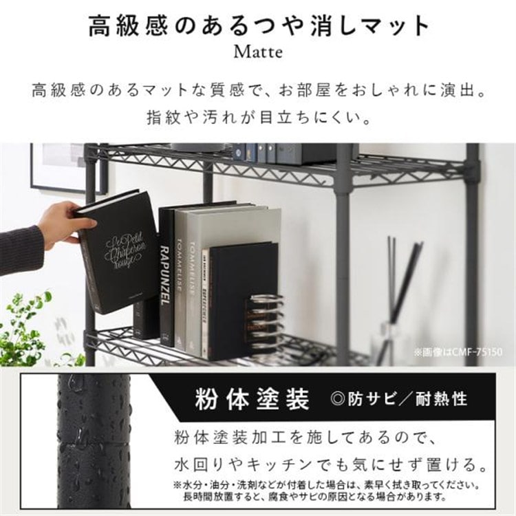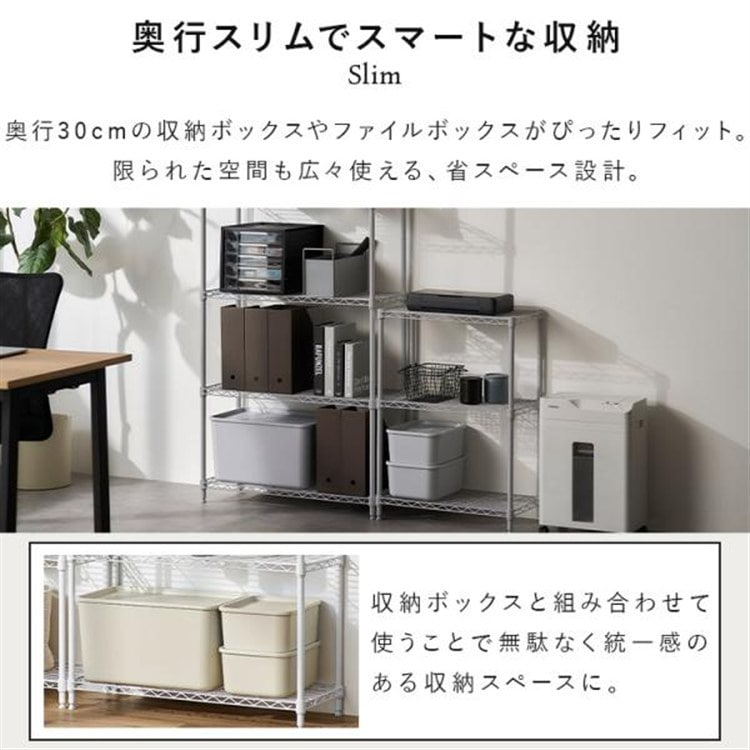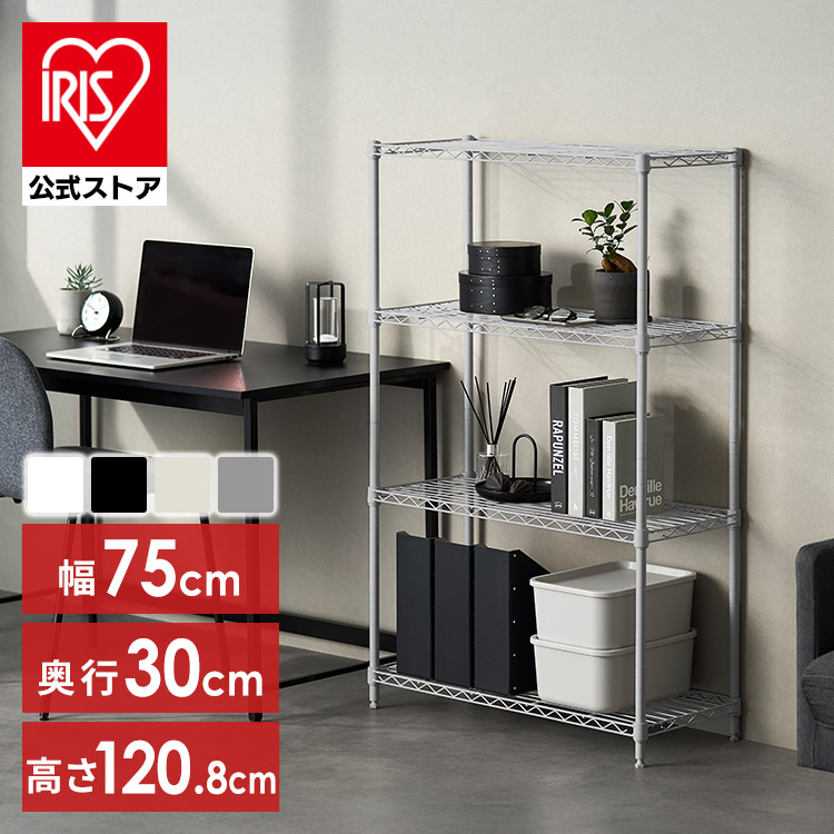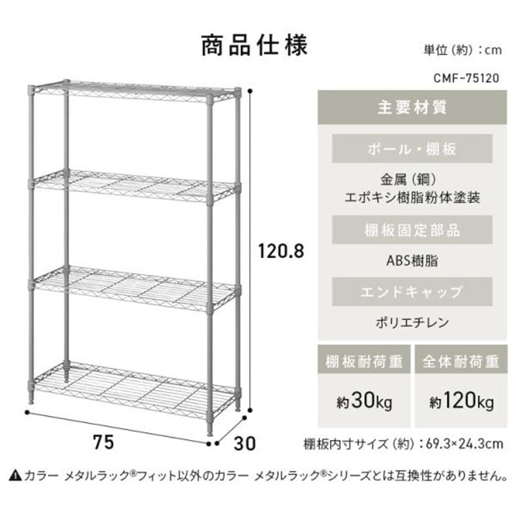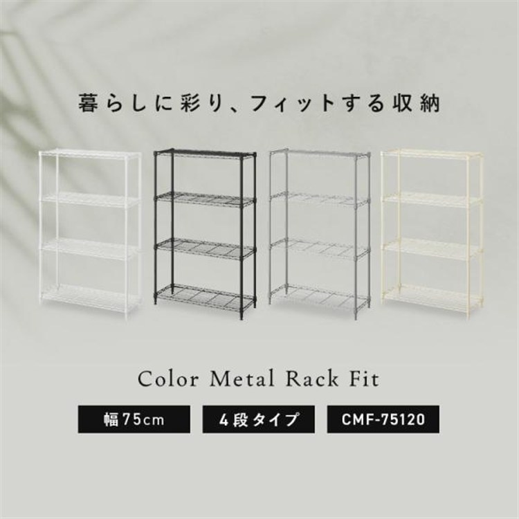 【商品説明】暮らしに彩り、フィットする収納。奥行30cm、スリムでどんなお部屋にもぴったりフィット。スペースを無駄なく活用。◆カラーメタルラックフィットシリーズ暮らしになじむ4カラー。6タイプから組み合わせて自在にカスタマイズ。置きたい場所やものに合わせて選べる。◆高級感のあるつや消し加工高級感のあるマットな質感で、お部屋をおしゃれに演出。指紋や汚れが目立ちにくい。◆奥行スリムでスマートな収納奥行30cmで収納ボックスがぴったりフィット。限られた空間も広々使える、省スペース設計。収納ボックスと組み合わせて使うことで無駄なく統一感のある収納スペースに。◆高さ自由、収納自在棚板は約2.5㎝間隔で微調整可能。スペースを最大限に活用できる。置き場所や用途に合わせて自分好みにカスタマイズ。棚板を外せば、ランドリーラックやゴミ箱上ラックにも。◆アジャスター付きの脚高さの微調整ができ、ガタつきを抑えるアジャスター付きです。◆棚板一枚あたり耐荷重30kg◆ドライバー不要の簡単組み立てゴムハンマーの使用をお勧めします。★お客様組立★【商品仕様】●商品サイズ(cm)外寸(アジャスター含):幅約75×奥行約30×高さ約121棚板内寸サイズ:幅約69.3×奥行約24.3●質量約6.16kg●棚板4枚●ポール直径約19mm●耐荷重全体:約120kg棚板(1枚あたり):約30kg●主要材質金属部:金属(鋼)(エポキシ樹脂塗装)棚板固定パーツ・アジャスター:ABSエンドキャップ:ポリエチレン●カラーマットホワイト、マットブラック、グレージュ、ダークグレー