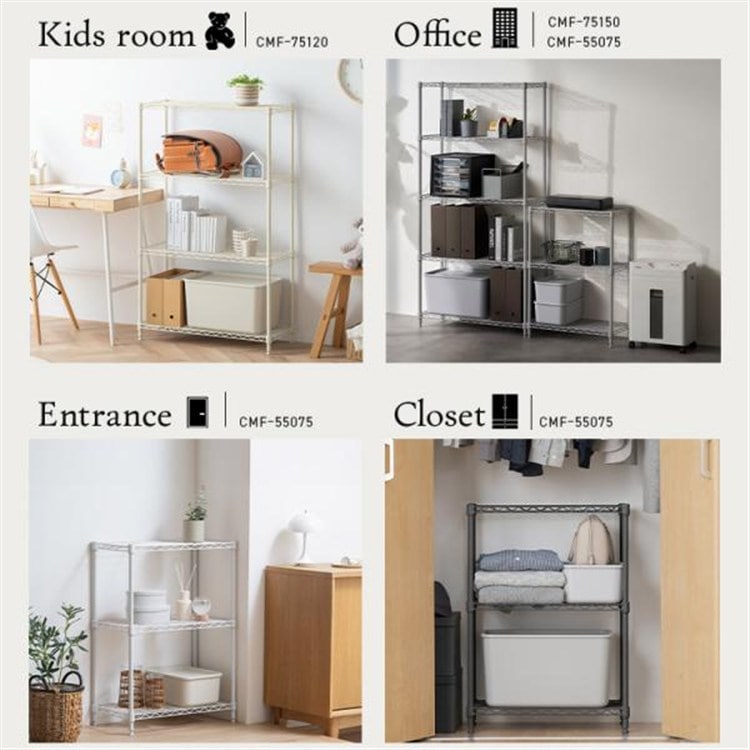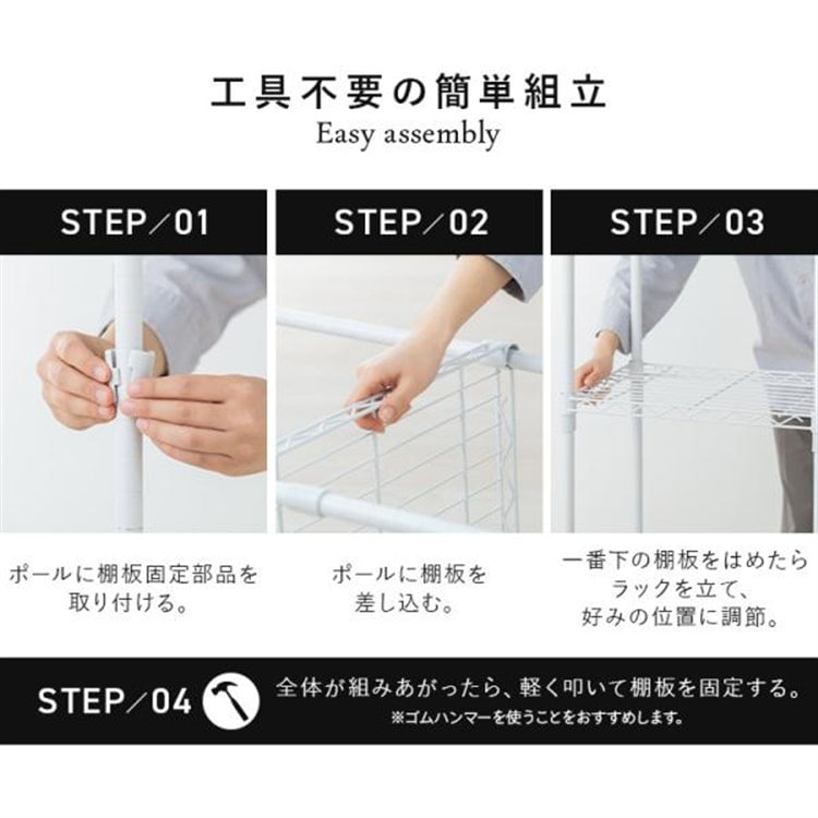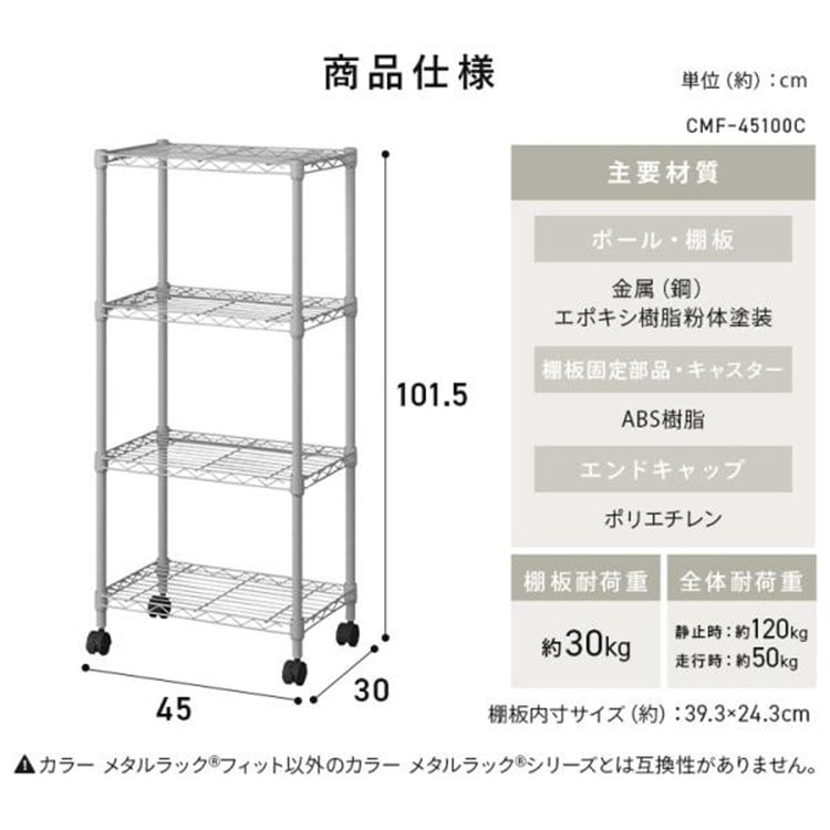 【商品説明】暮らしに彩り、フィットする収納。奥行30cm、スリムでどんなお部屋にもぴったりフィット。スペースを無駄なく活用。◆カラーメタルラックフィットシリーズ暮らしになじむ4カラー。6タイプから組み合わせて自在にカスタマイズ。置きたい場所やものに合わせて選べる。◆高級感のあるつや消し加工高級感のあるマットな質感で、お部屋をおしゃれに演出。指紋や汚れが目立ちにくい。◆奥行スリムでスマートな収納奥行30cmで収納ボックスがぴったりフィット。限られた空間も広々使える、省スペース設計。収納ボックスと組み合わせて使うことで無駄なく統一感のある収納スペースに。◆高さ自由、収納自在棚板は約2.5㎝間隔で微調整可能。スペースを最大限に活用できる。置き場所や用途に合わせて自分好みにカスタマイズ。棚板を外せば、ランドリーラックやゴミ箱上ラックにも。◆キャスター付きで移動がラクラク掃除や移動もスムーズ。◆棚板一枚あたり耐荷重30kg◆ドライバー不要の簡単組み立てゴムハンマーの使用をお勧めします。★お客様組立★【商品仕様】●商品サイズ(cm)外寸(キャスター含む):幅約45×奥行約30×高さ約102棚板内寸サイズ:幅約39.3×奥行約24.3●質量約4.89kg●棚板4枚●ポール直径約19mm●耐荷重全体 静止時:約120kg 走行時:約50kg棚板(1枚あたり):約30kg●主要材質金属部:金属(鋼)(エポキシ樹脂塗装)棚板固定パーツ・キャスター:ABSエンドキャップ:ポリエチレン●カラーマットホワイト、マットブラック、グレージュ、ダークグレー