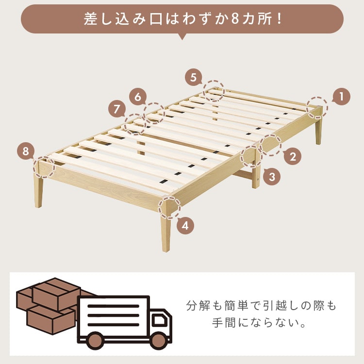 【商品説明】届いて3分、組立簡単!工具不要/スピード組立/通気性◆工具不要・組立簡単パーツをはめるだけ!工具いらずで、組み立てが苦手な方でも簡単に組み立てられます。◆優れた通気性通気性に優れたすのこベッドで汗・湿気を逃がし、一年通して清潔で快適に眠れます。◆大容量ベッド下収納収納ボックスを使用すると、ベッド下のデッドスペースが収納スペースに早変わり!◆安心の強度安心の最大使用者体重90kgで耐久性のあるベッドフレーム。◆天然木使用ベッドフレームには天然木ラバーウッド材を使用。美しい木目の風合いや経年の変化を楽しめます。◆置き場所を選ばないお部屋になじむナチュラルなデザイン。高さを抑えた設計で、窓下に置くのにもぴったり。★お客様組立★【商品仕様】●商品サイズ(cm)幅約99×奥行約205.6×高さ約32●主要材質パーティクルボード(UV塗装)、ラバーウッド、積層材、金属(鋼)●最大使用者体重約90kg※2人以上での組立をおすすめします。※軍手をご用意ください※インパクトドライバーは使用しないでください。破損するおそれがあります。