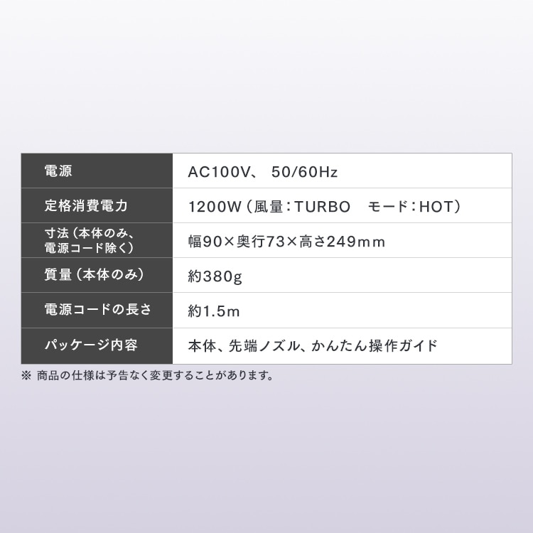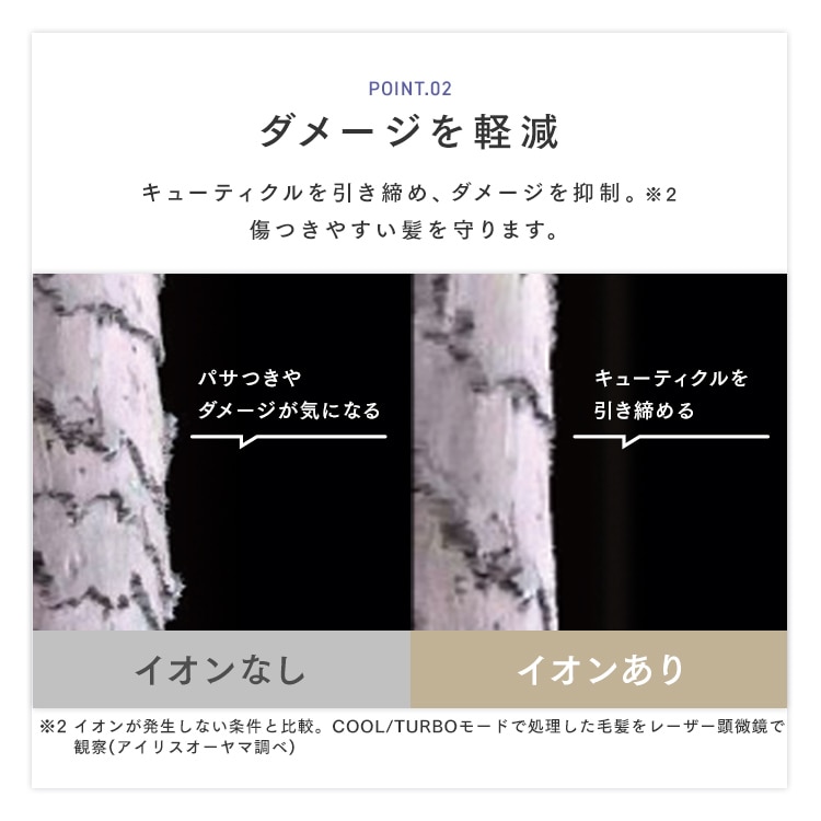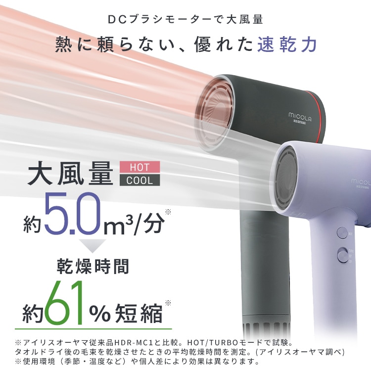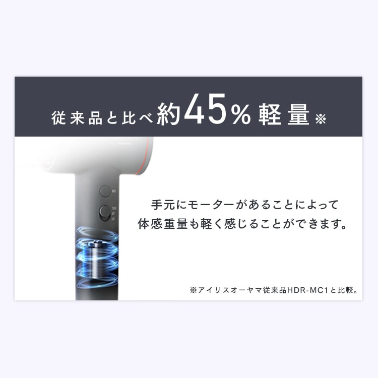 【商品説明】風量・風速UP!クイックイオンドライヤー◆早く乾かしたい!を叶える大風量で速乾大風量約5.0m3/分※1で早く乾く。DCブラシレスモーター採用で大風量を実現。◆「プラスマイナスイオン」でワンランク上のサラツヤ髪へプラスイオンとマイナスイオンを発生させ静電気を抑制。ツヤまとまりUP!◆選べるモードでなりたいスタイリングが叶う風量2段階と温風温度4段階で目的に合わせて使い分け。・風量:TURBO/SET・温度:4段階HOT:高温風で髪と地肌を素早く乾かす。WARM:中温風で髪の中間から毛先を乾かすときに。SCALP:低温風で地肌をいたわり優しく乾かす。COOL:キューティクルを引き締め、仕上げのクセ付けに。◆軽量設計で毎日のケアをお手軽に本体重量約380g。さらに、手元にモーターがあることによって体感重量も軽く!※1:TURBO時・ノズルなし(アイリスオーヤマ調べ)。※使用環境(季節・温度など)や個人差により効果は異なります。【商品仕様】●商品サイズ(cm)(本体のみ、電源コード除く)幅約9×奥行約7.3×高さ約24.9●製品質量(本体のみ)約380g●定格電源AC100V、50/60Hz●定格消費電力1200W(風量:TURBO、モード:HOT)●風量(TURBO時・ノズルなし)約5.0m3/分●電源スイッチTURBO/SET/OFF●切り替ボタン(本体ランプ色:モード)赤:HOT 高温風で髪と地肌を素早く乾かしたいときなどにピンク:WARM 中温風で髪の中間から毛先を乾かすときなどに青:SCALP 低温風で地肌をいたわりながら優しく乾かしたいときなどに点灯無し:COOL※ キューティクルを引き締め、クセづけなどの仕上げに※長押しでCOOLに変わります。もう一度長押しすると元のモードに戻ります。●電源コードの長さ約1.5m●付属品先端ノズル●カラーダークグレー、ラベンダー