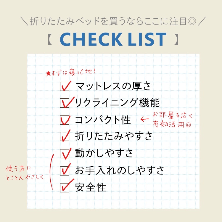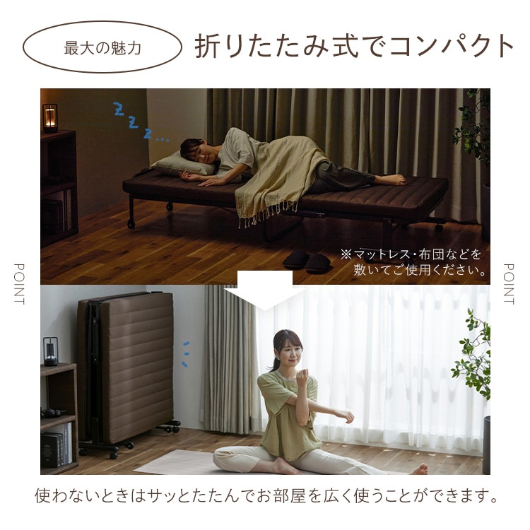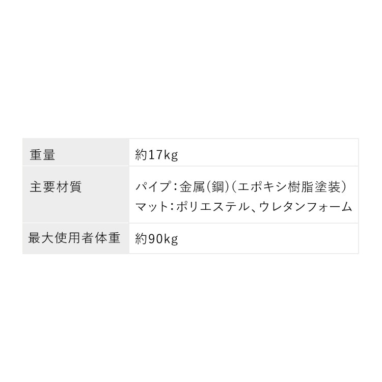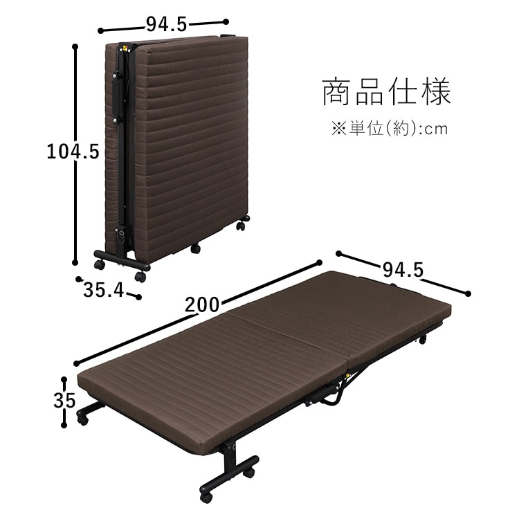 【商品説明】お部屋と暮らしにフィットする、折りたたみベッドです。 初めて折りたたみベッドを購入される方にもおすすめです。 【“厚さ:約8cm”やわらかなマット】 マットにはやわらかなウレタンフォームを使用しています。 お手持ちの敷布団やマットレスと組み合わせてご使用ください。 【リクライニング機能:14段階】 角度を細かく調節できます。 自分好みのラクな姿勢にぴったり合わせられます。 【コンパクト収納“折りたたみ式”】 使わないときは折りたたんでコンパクトに収納できるため、お部屋を広く使えます。 またホコリがたまりやすいベッド下もすみずみまでお掃除ができます。 【安心機能も充実】 隙間があるので折りたたんだときも指が挟まりにくい設計です。 他にもしっかり固定できる「ストッパーピン」や、ベッド位置がズレにくくなる「キャスターロック」などの安心機能も搭載しています。 ★お客様組立★ ●商品サイズ(cm) 使用時:幅約94.5×奥行約200×高さ約35 折りたたみ時:幅約94.5×奥行約35.4×高さ約104.5 ●製品質量 約17kg ●最大使用者体重 約90kgまで ●材質 パイプ:金属(鋼/エポキシ樹脂塗装) マット:ポリエステル、ウレタンフォーム